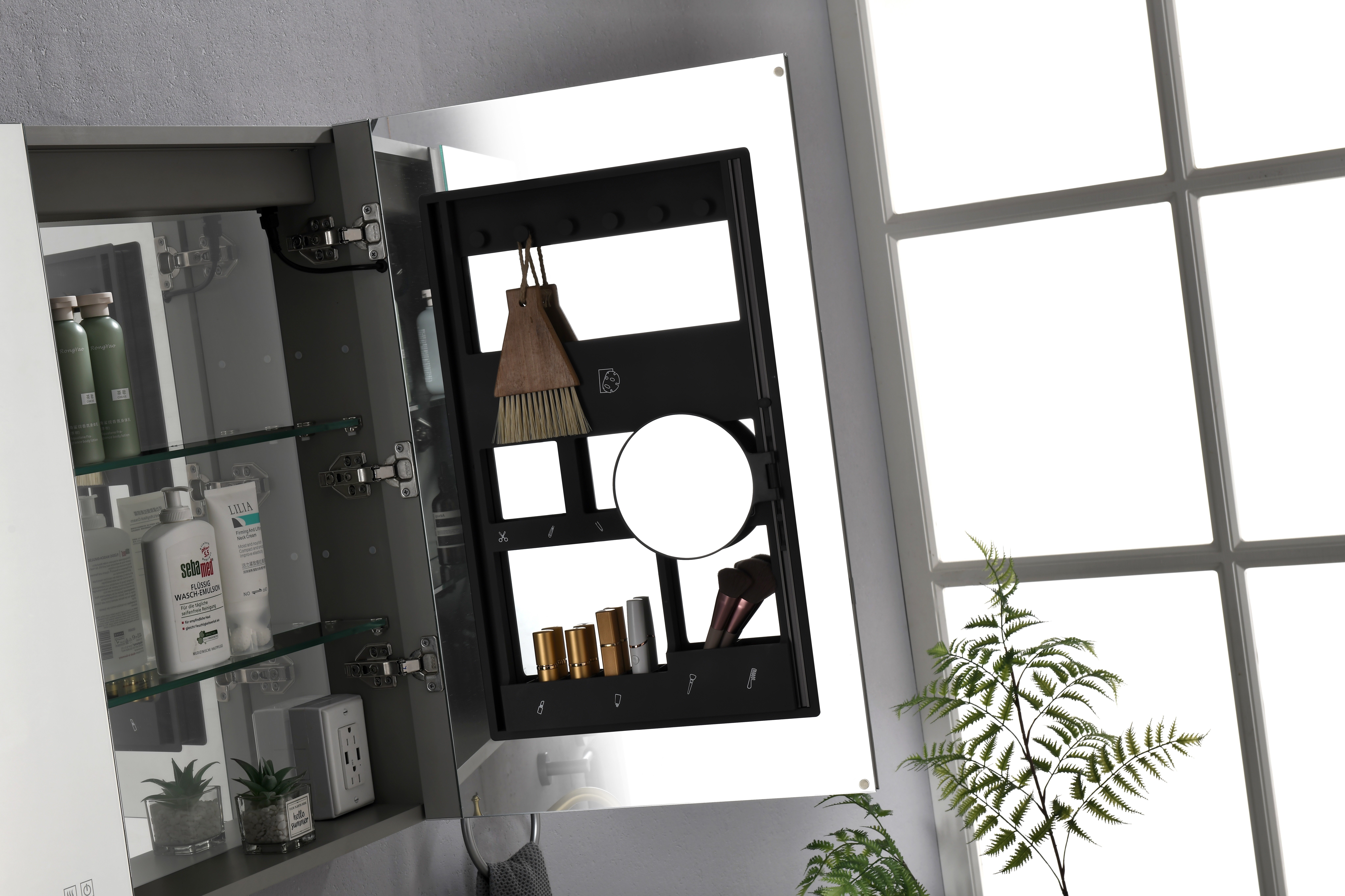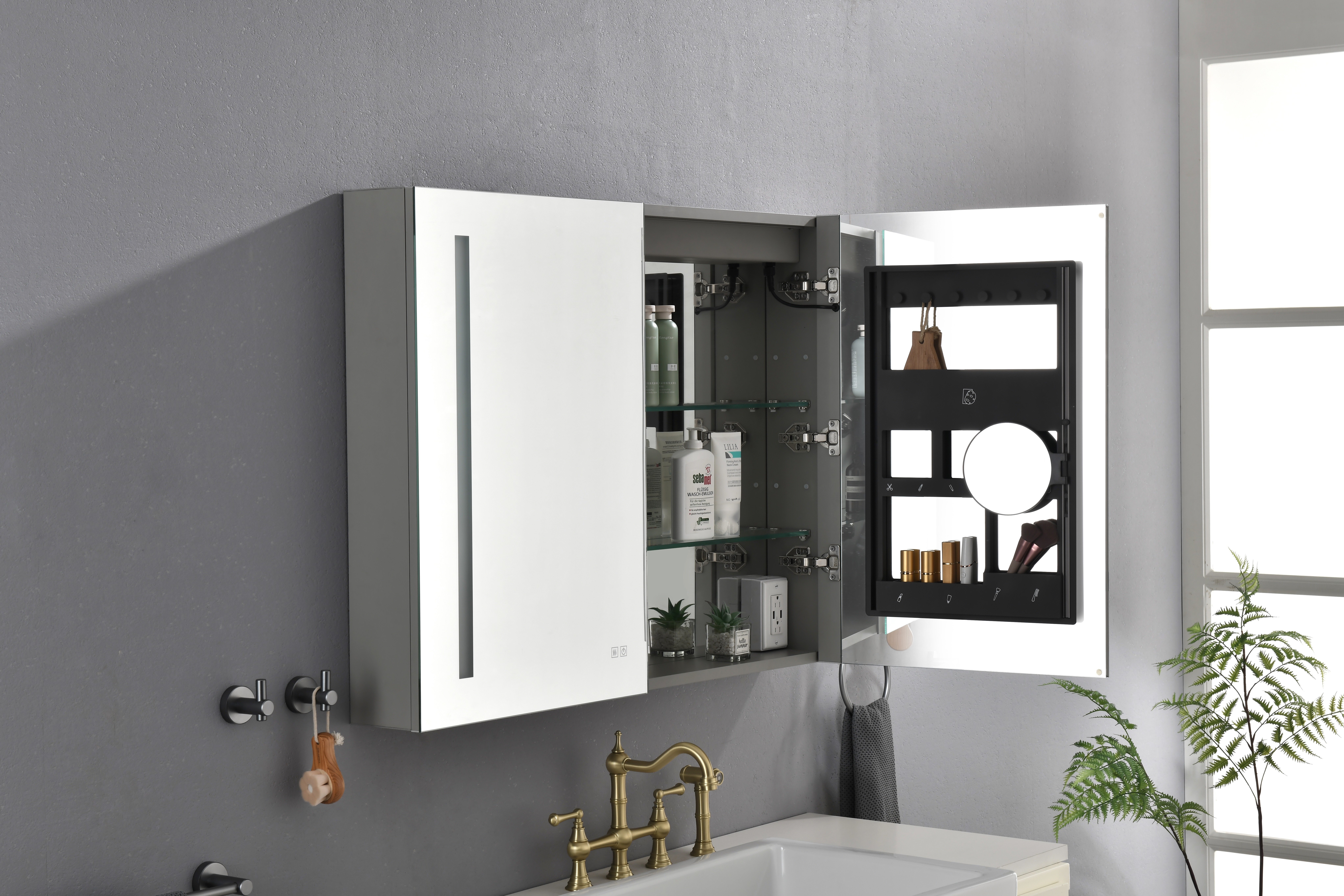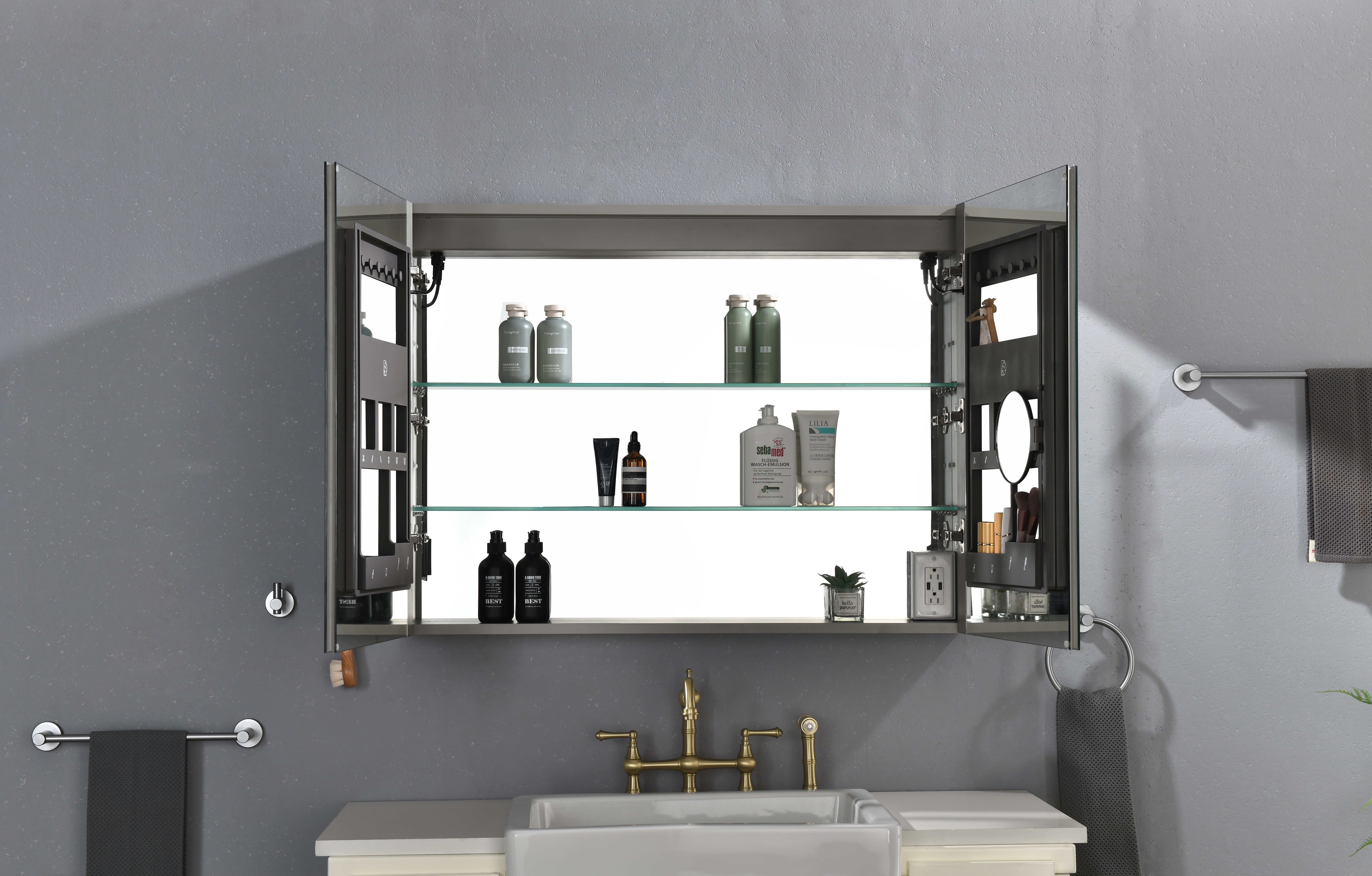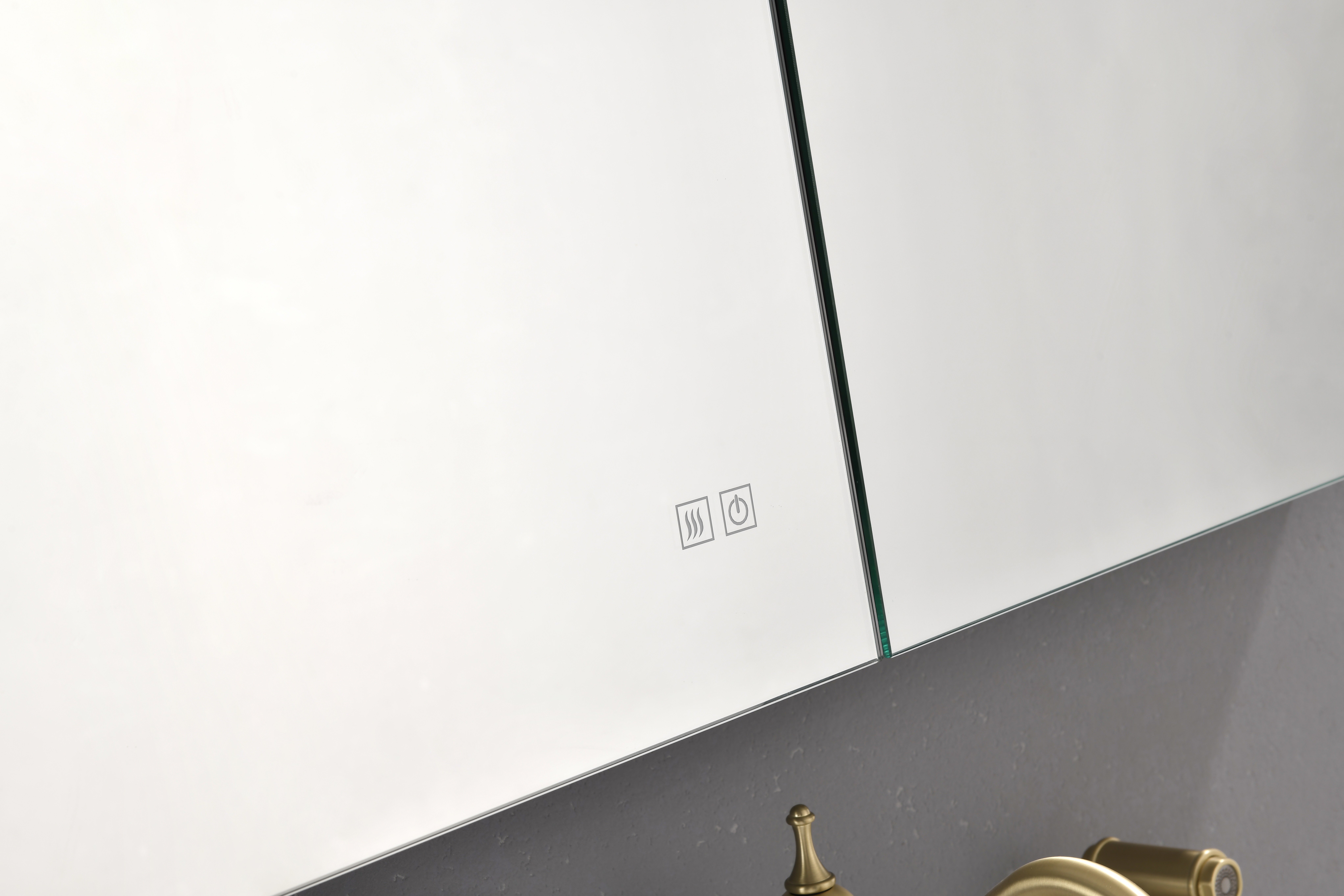 THREE SOFT TOUCH SWITCH makes this LED Medicine Cabinet simple and easy to turn ON/OFF; adjust brightness and change color temperature. fogless makeup time is just one touch away. provides you three levels of brightness options: 5%; 50%; 100%. COLOR TEMPERATURE ranges from 3000K - 6000K offers you choices of different light colors for different purposes. All these features make it the perfect led mirror medicine cabinet. Mirrors on both sides of the door; interior walls & both side panels; which makes it a bathroom cabinet with mirror on all sides. Three medicine cabinet shelf. Built-in 20Amp dual outlet and USB 2.0 port for phone or shavers charging inside this bathroom mirror medicine cabinet. 3 TIMES AMPLIFY MIRROR makes it super easy for makeup tasks. and convenience to your bathroom. Smart memory function remembers your favorite setting; no need to adjust every time you turn on the mirror. CRI 90+ light source reproduces high-quality task lights perfect for making up. 5 mm COPPER FREE silver medicine cabinet mirror prevents black edges in the harsh bathroom environment. Guaranteed 50; 000 hours lifetimes and 100; 000 times switch touch. High-end hardware brandsoft close hinges and provides strong support for large medicine cabinet. rated Anodized Aluminum Frame for extra durability. Scratch-free painting finish. Grooved door edges and corners for safe use.