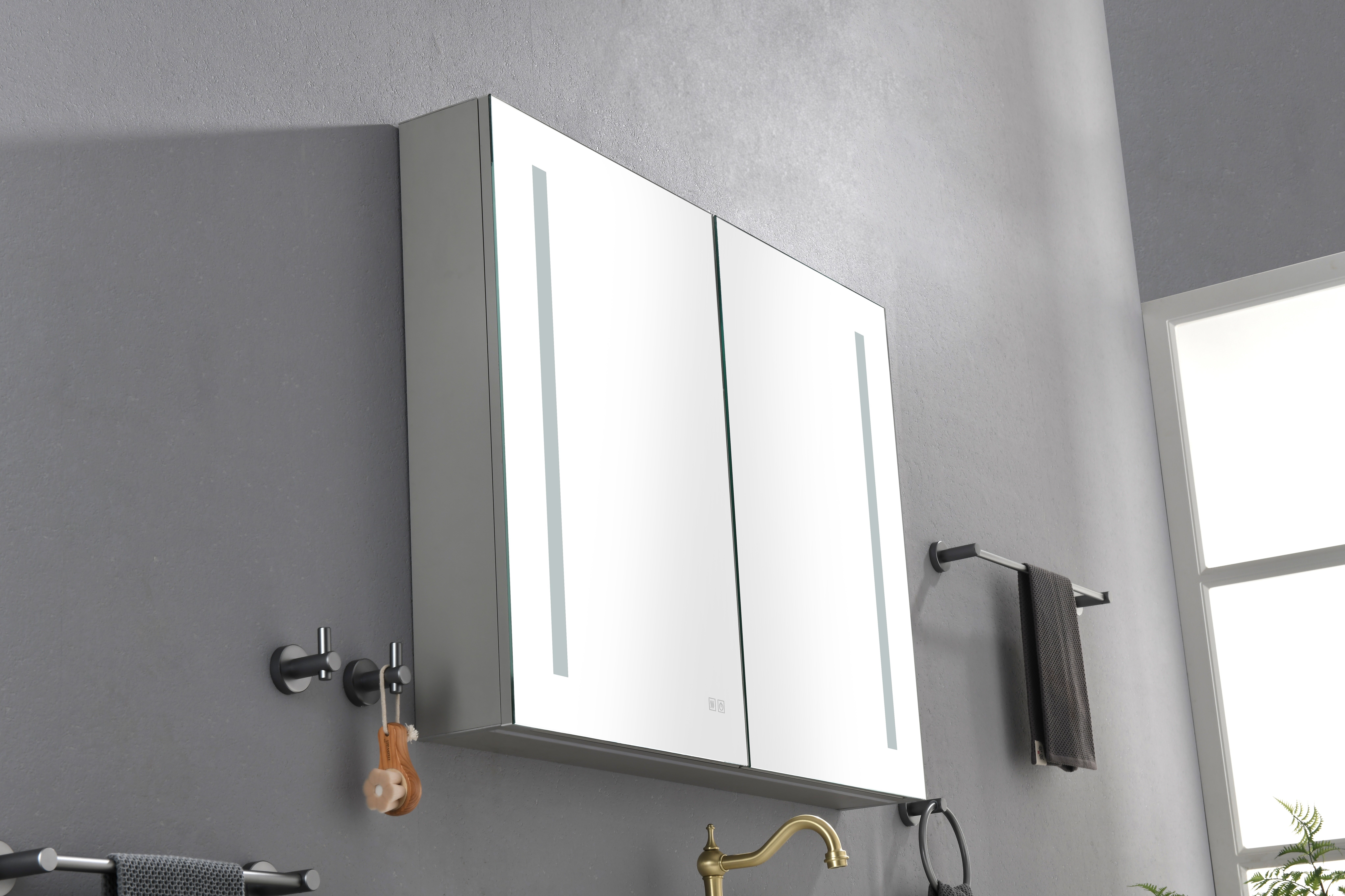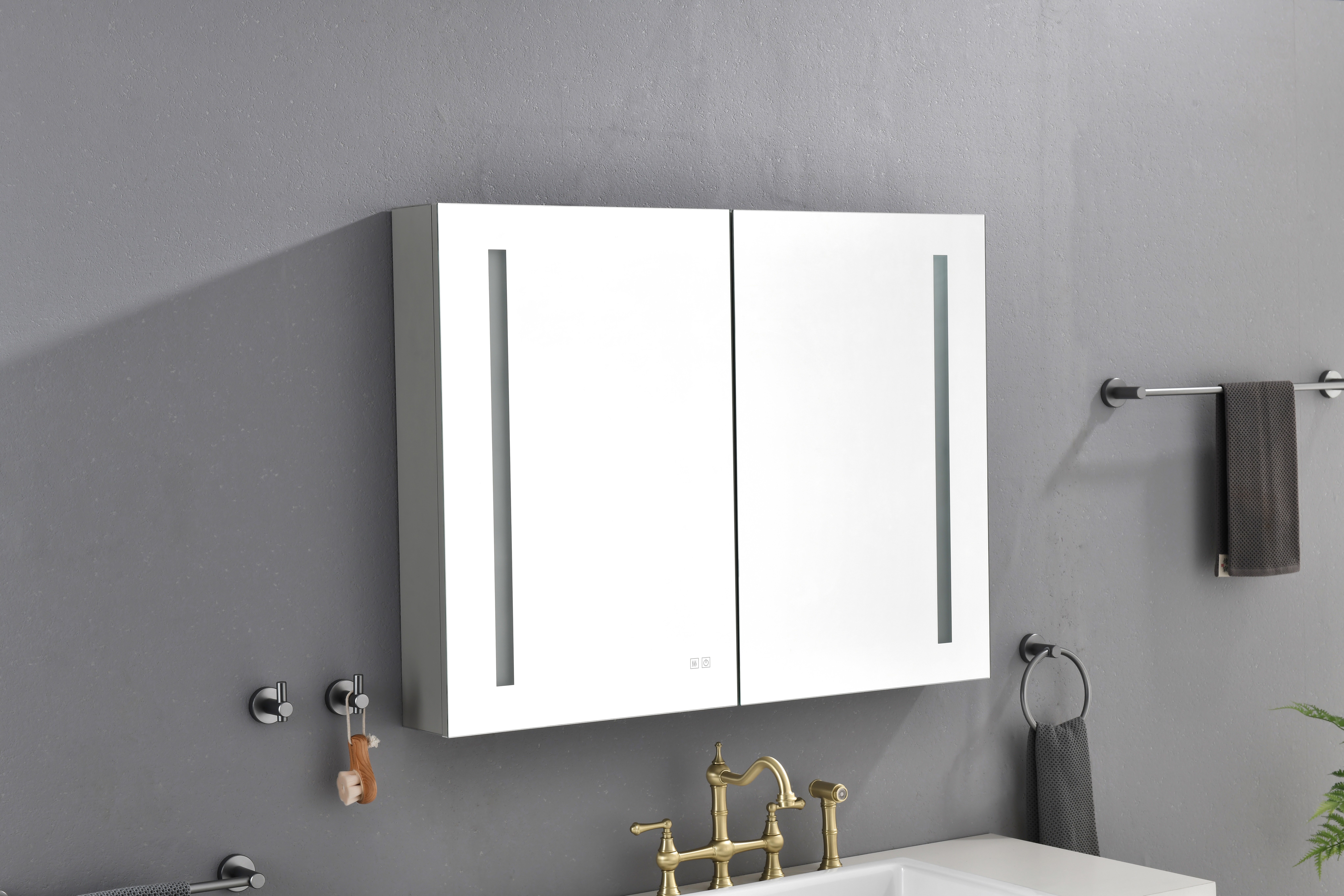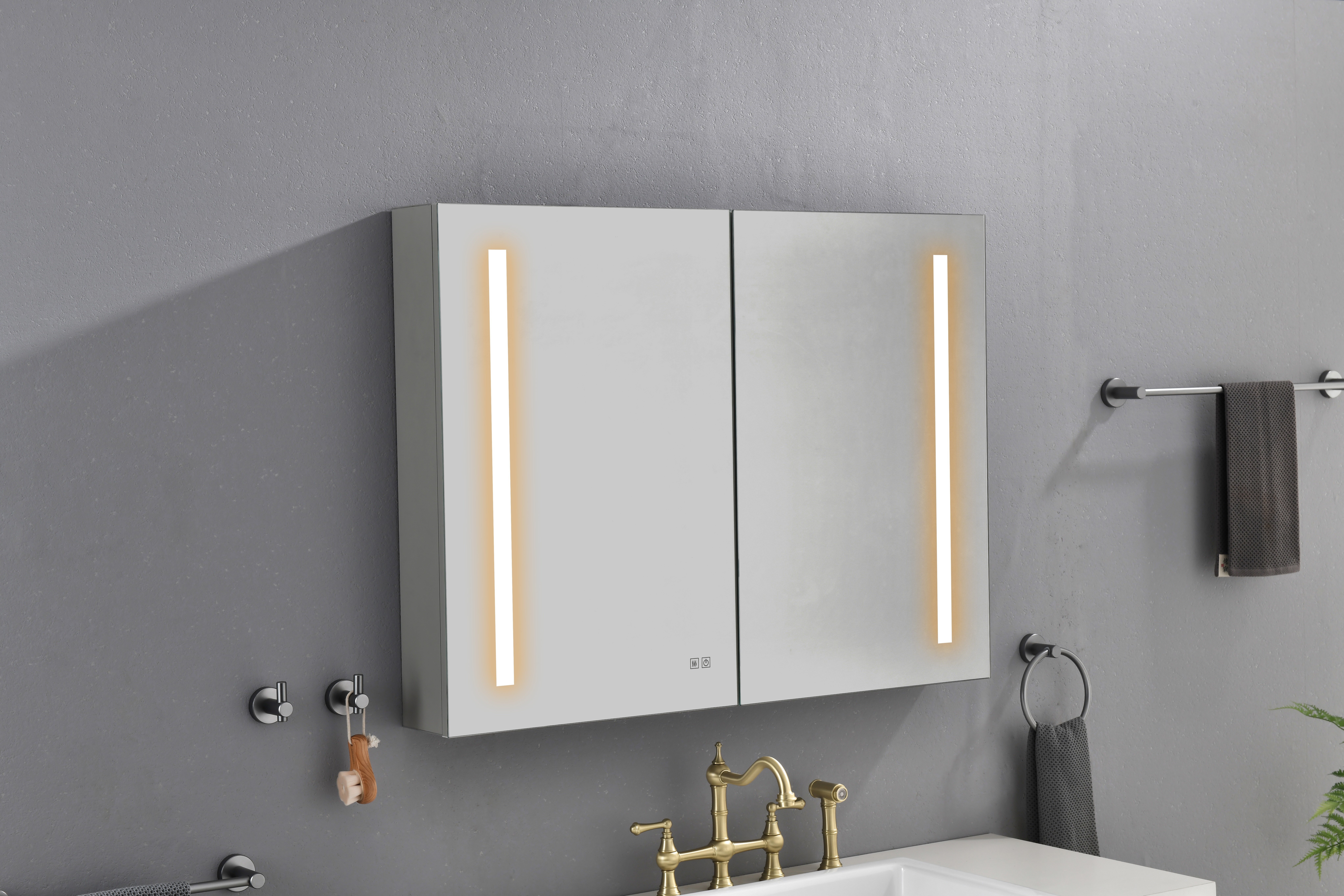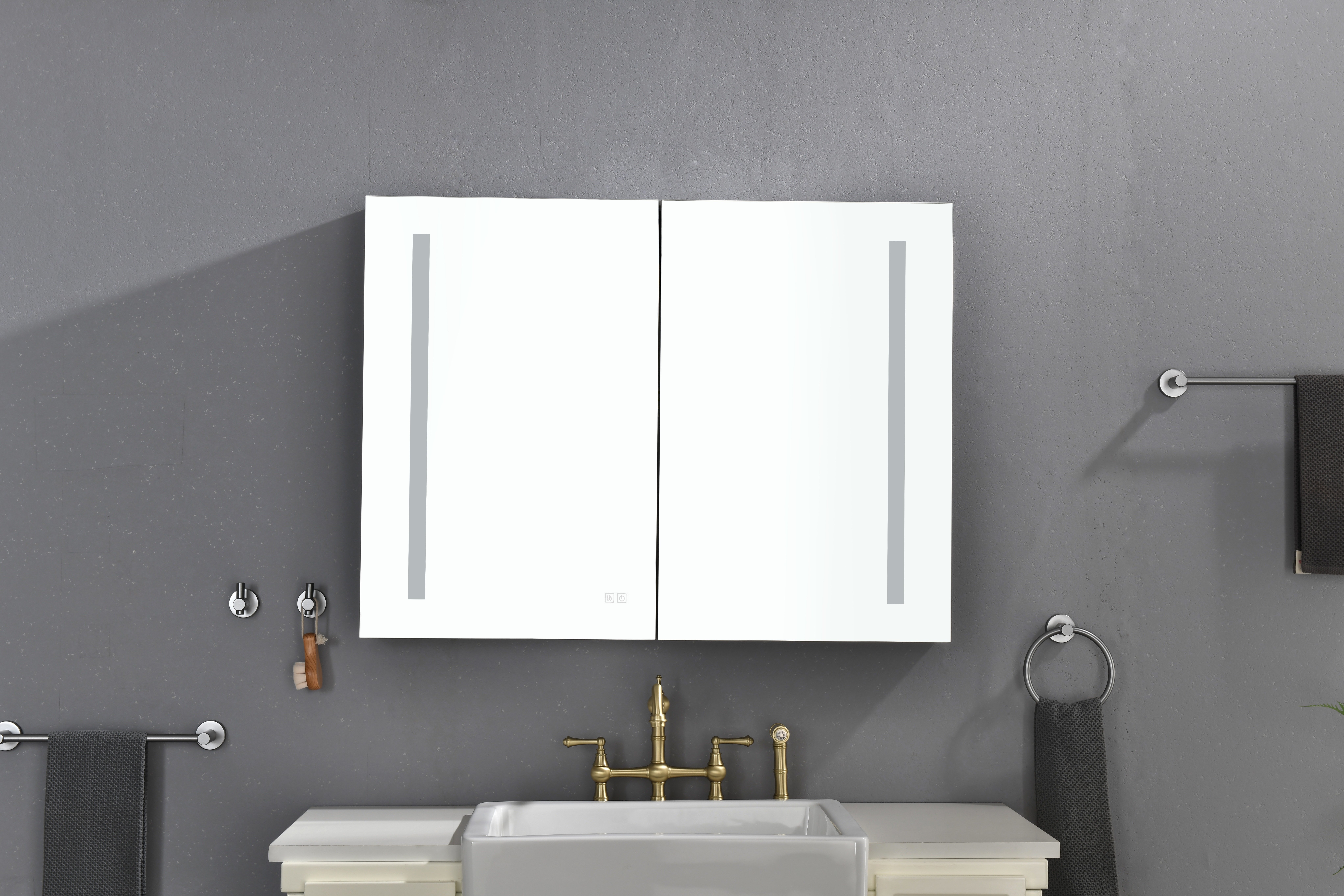 THREE SOFT TOUCH SWITCH makes this LED Medicine Cabinet simple and easy to turn ON/OFF; adjust brightness and change color temperature. fogless makeup time is just one touch away. provides you three levels of brightness options: 5%; 50%; 100%. COLOR TEMPERATURE ranges from 3000K - 6000K offers you choices of different light colors for different purposes. All these features make it the perfect led mirror medicine cabinet. Mirrors on both sides of the door; interior walls & both side panels; which makes it a bathroom cabinet with mirror on all sides. Three medicine cabinet shelf. Built-in 20Amp dual outlet and USB 2.0 port for phone or shavers charging inside this bathroom mirror medicine cabinet. 3 TIMES AMPLIFY MIRROR makes it super easy for makeup tasks. and convenience to your bathroom. Smart memory function remembers your favorite setting; no need to adjust every time you turn on the mirror. CRI 90+ light source reproduces high-quality task lights perfect for making up. 5 mm COPPER FREE silver medicine cabinet mirror prevents black edges in the harsh bathroom environment. Guaranteed 50; 000 hours lifetimes and 100; 000 times switch touch. High-end hardware brandsoft close hinges and provides strong support for large medicine cabinet. rated Anodized Aluminum Frame for extra durability. Scratch-free painting finish. Grooved door edges and corners for safe use.