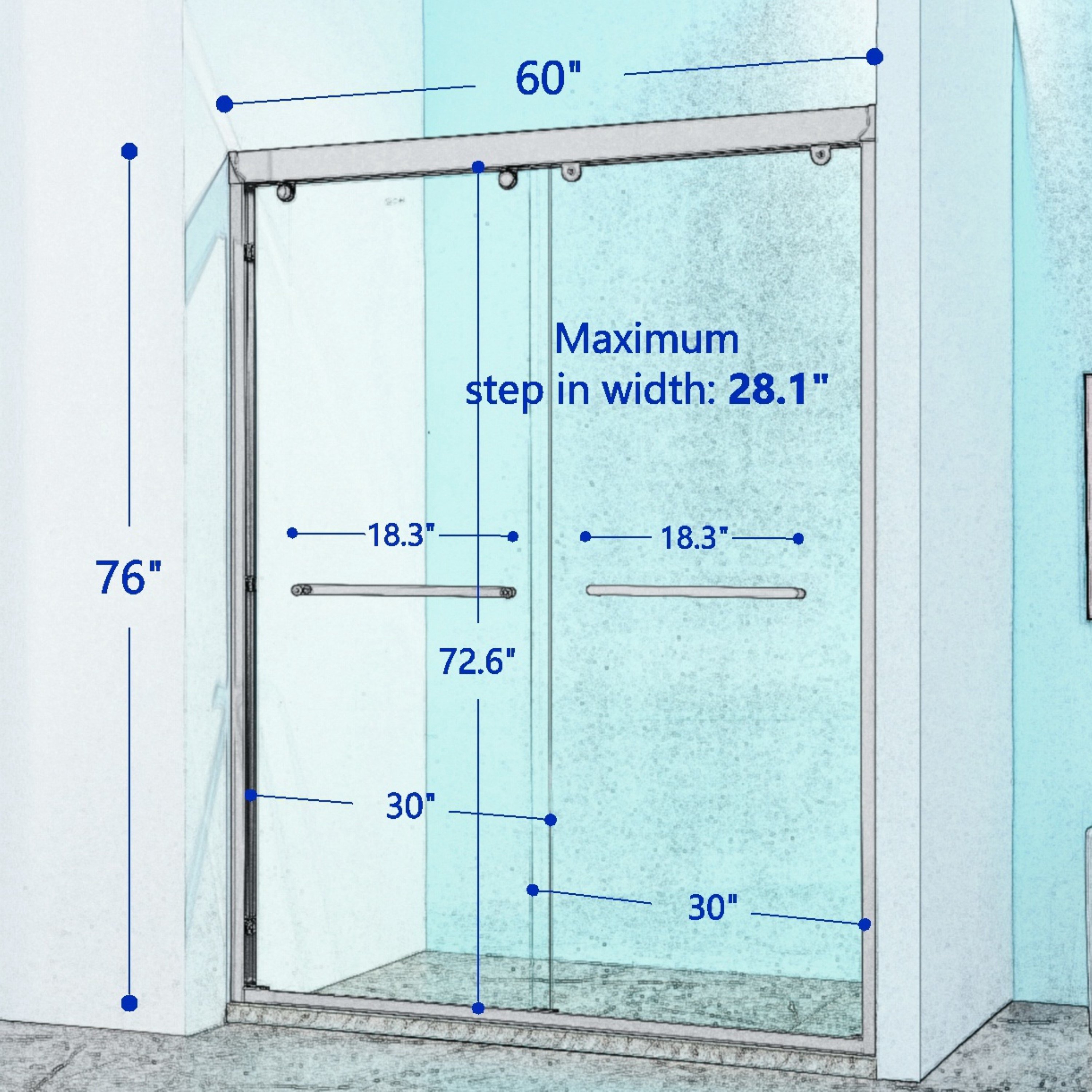 56-60"W x 76"H Double Sliding Shower Door, Aluminium Alloy Frame in Chrome, 5/16" (8mm) Thick SGCC Tempered Clear Glass.