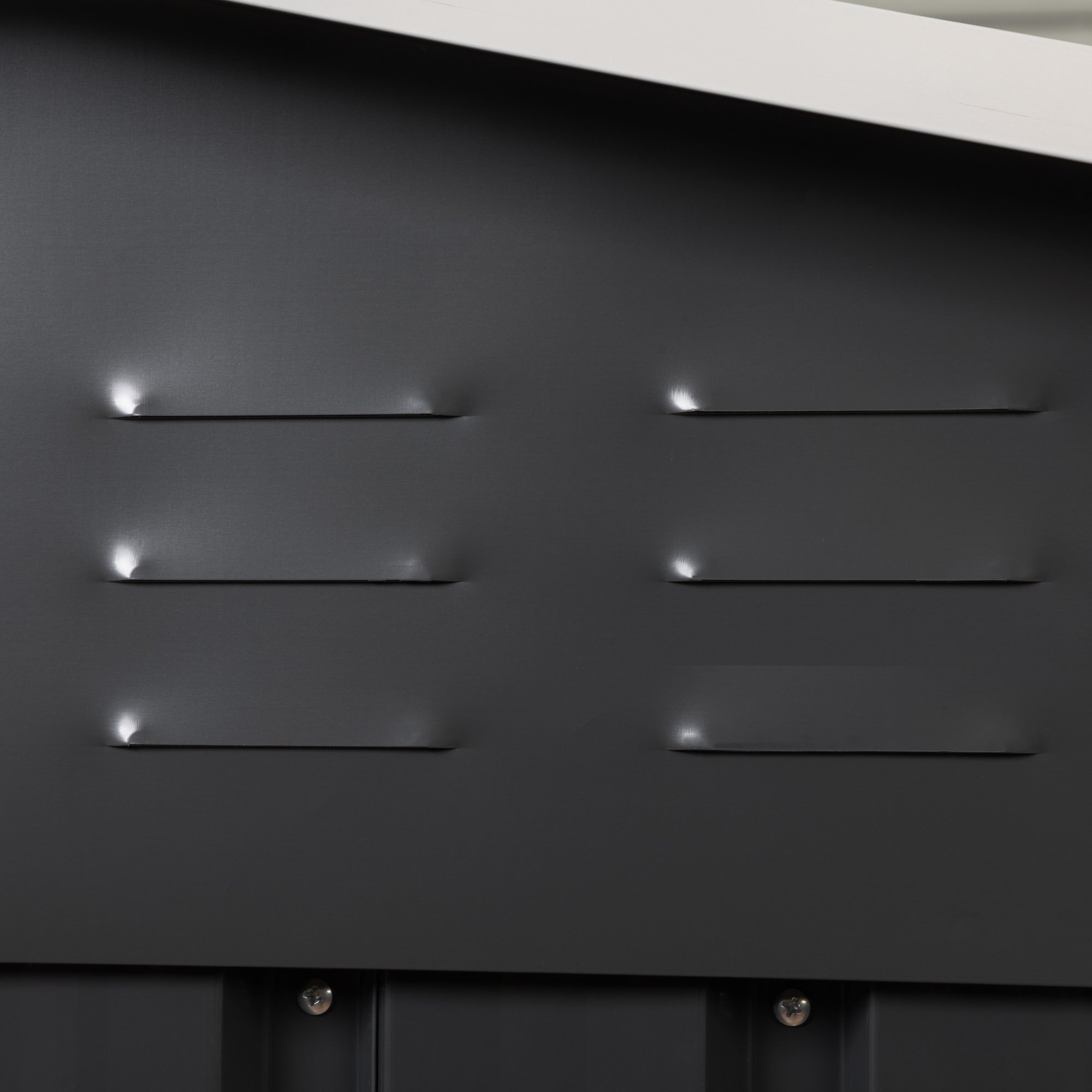 [Easy Access and Good Ventilation]: A sliding front door (36.61"W x 63.2"H) allows you to walk in conveniently for DIY organization and lock the doors when walking out for safety. 4 built-in vents ensure sufficient ventilation, keeping tools in good condition.