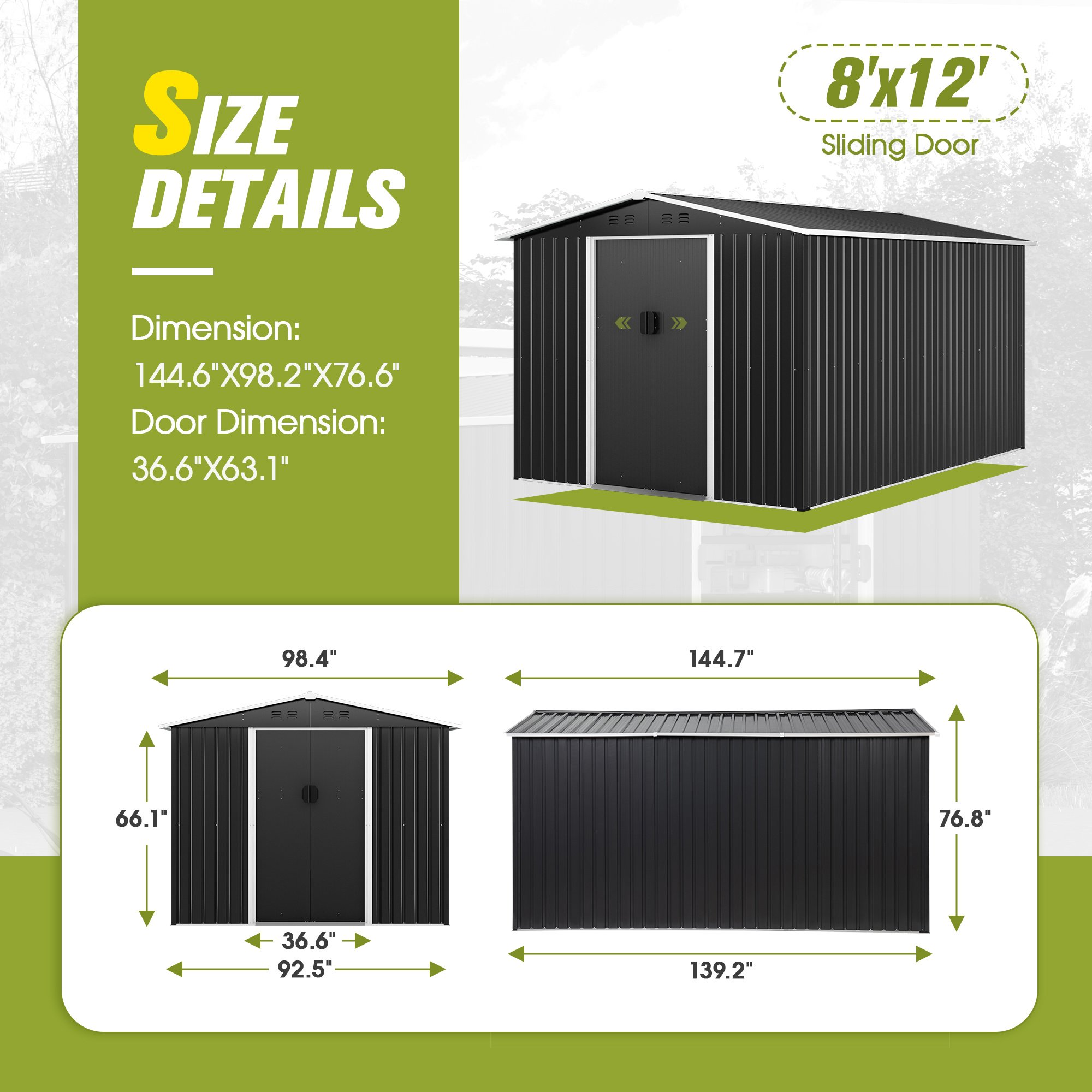 [Ample Outdoor Tool Shed]: Measured 12.06'L x 8.19' x 6.38'H, this large shed is perfect for organizing garden tools, bikes, lawn equipment, and pool supplies, helping get rid of clutter in your backyard, garden, patio, and lawn.