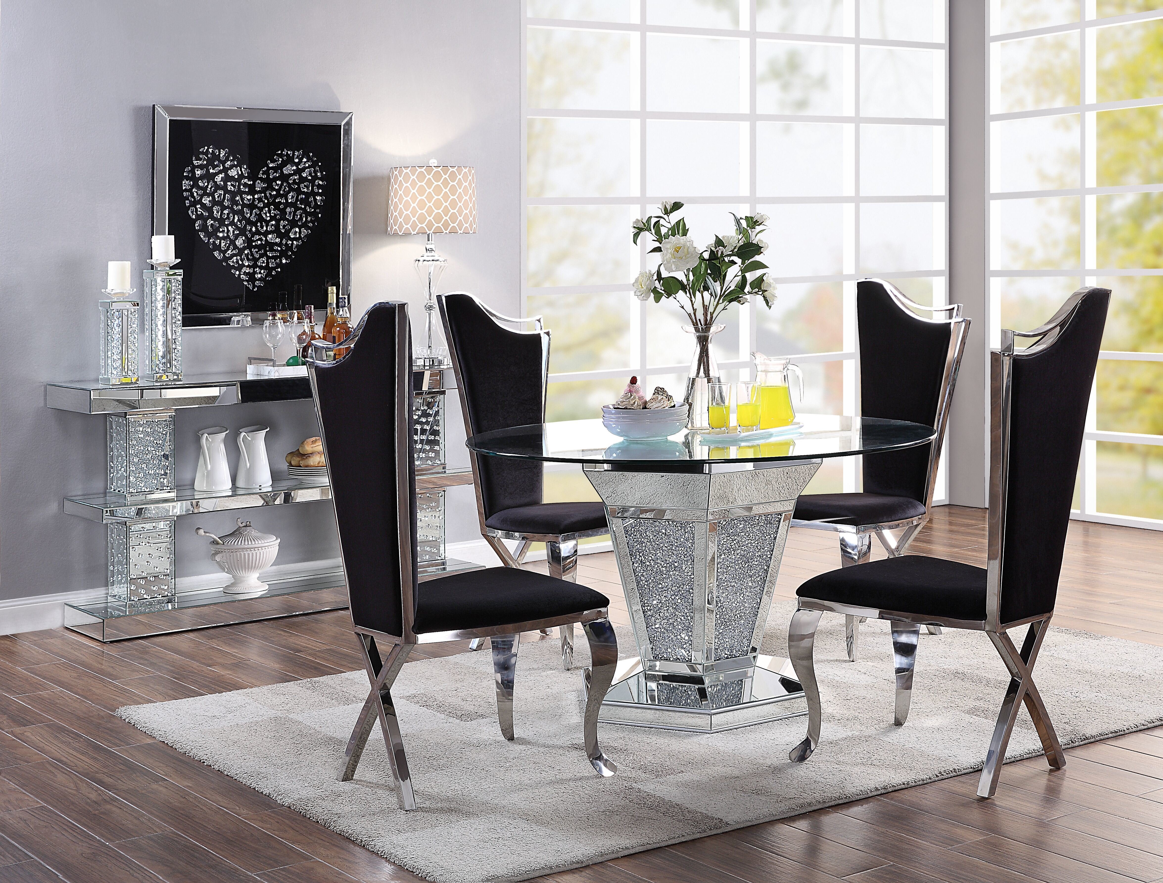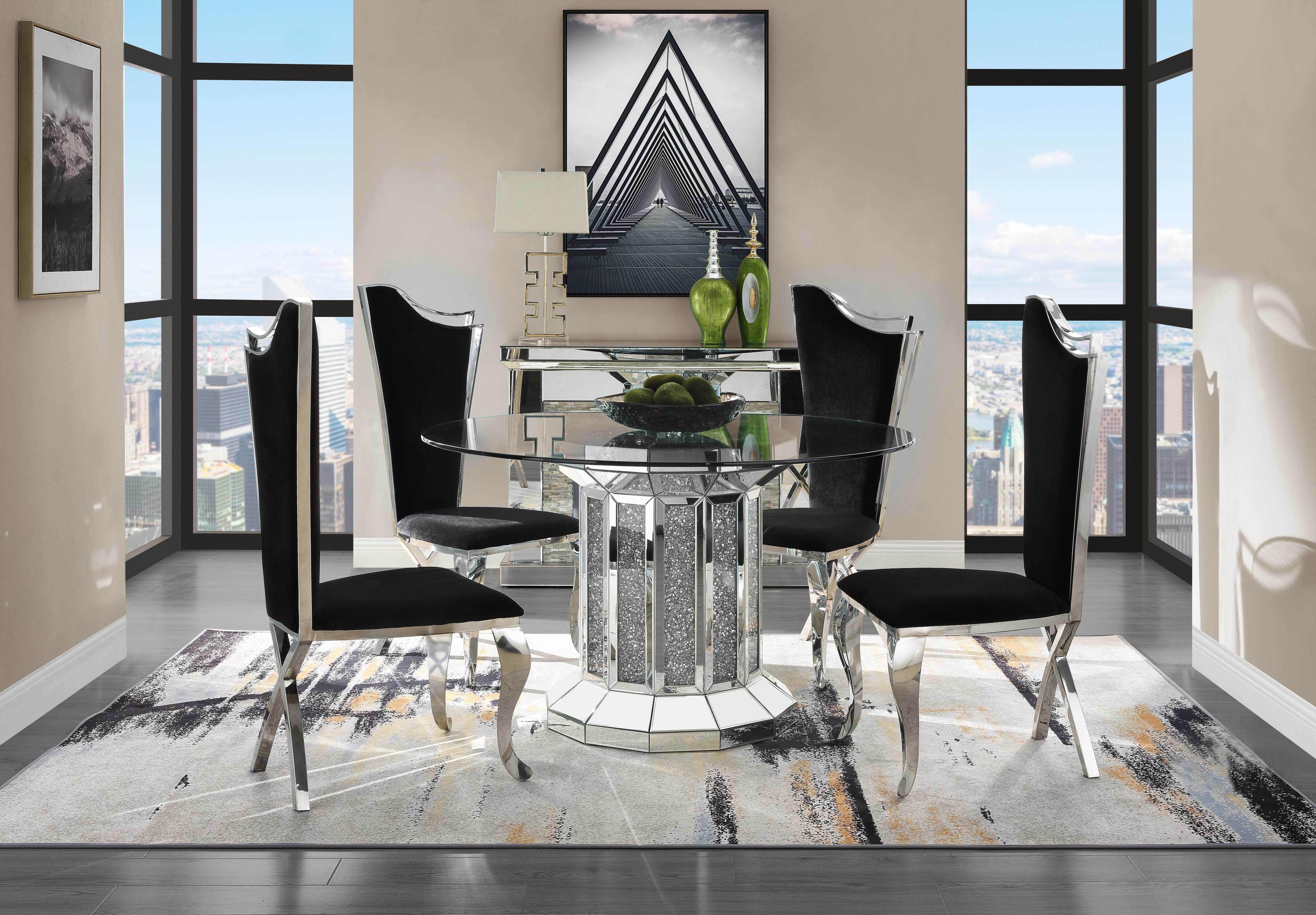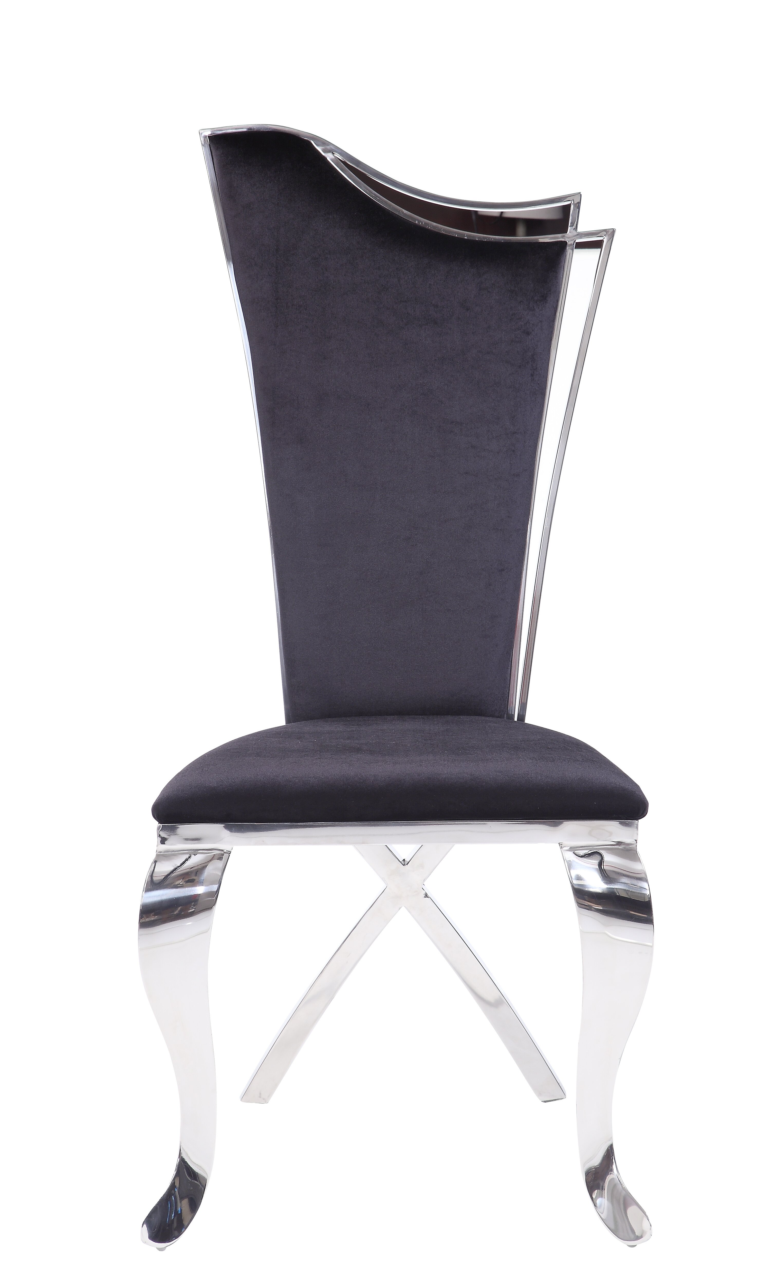 Set includesSet includes: Two (2) side chairsDimensions43 inches high x 21 inches wide x 20 inches deepMaterialsFabric, Stainless Steel, Plywood, FoamFabric ColorBlackFinish ColorSilver