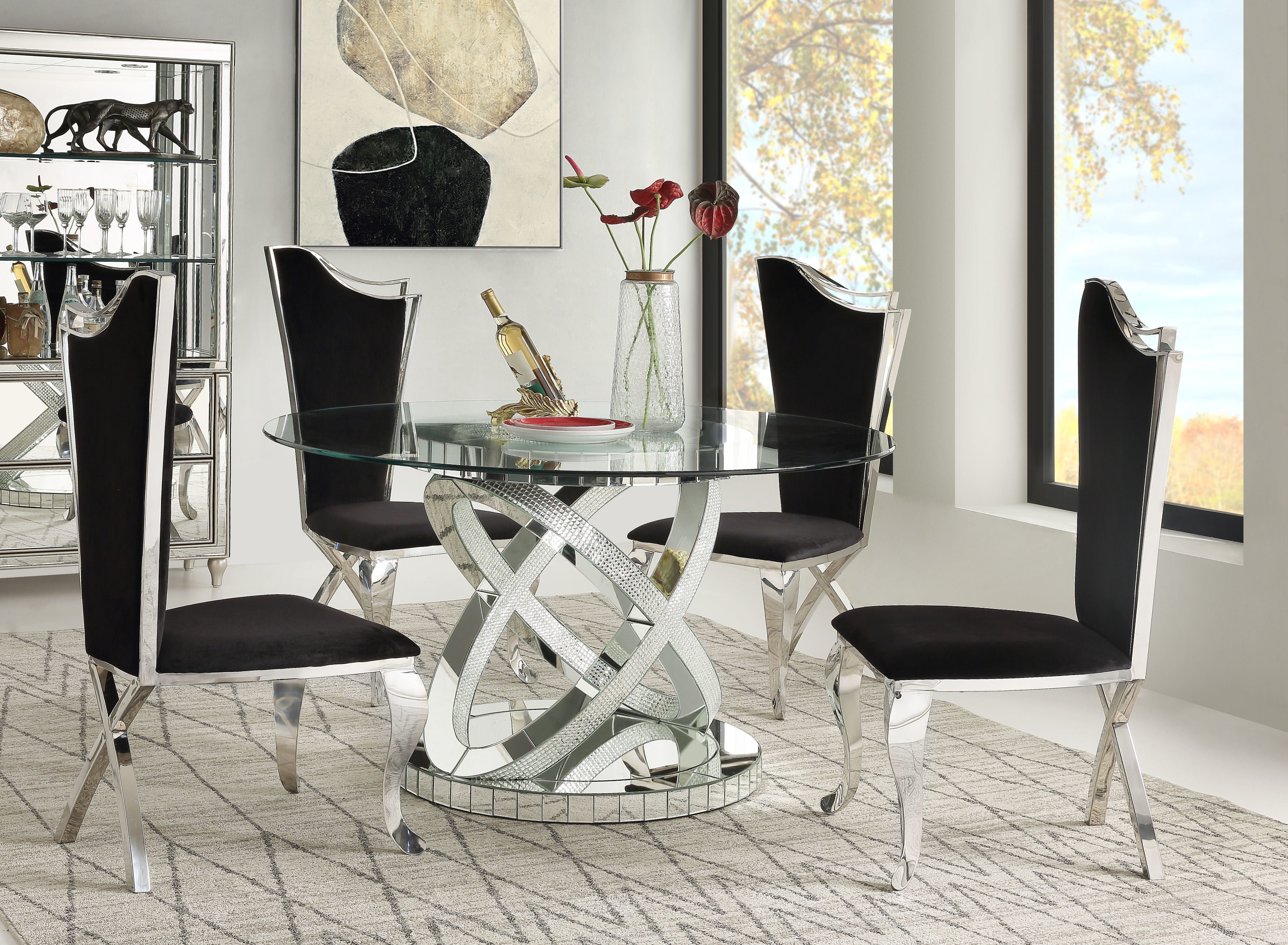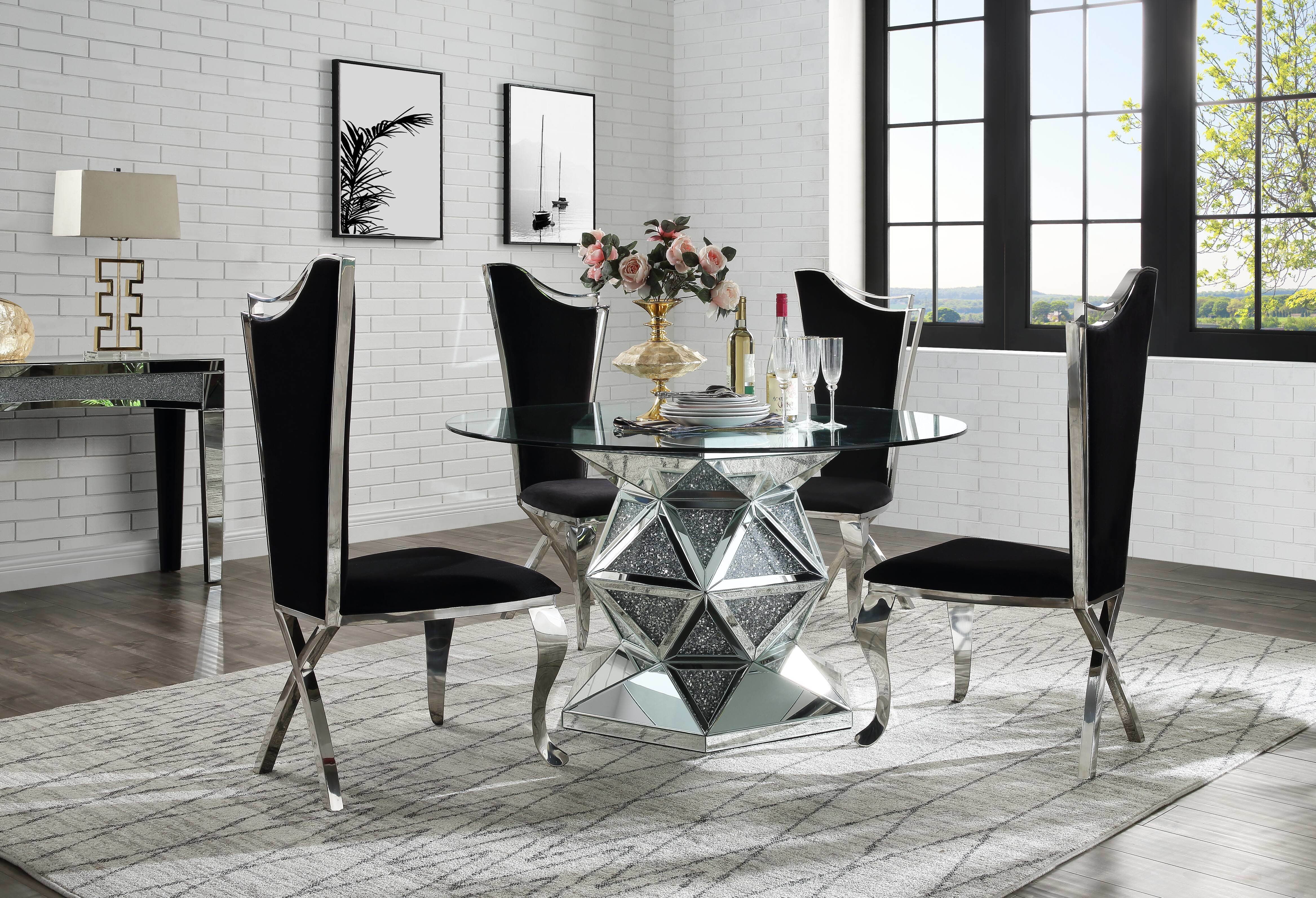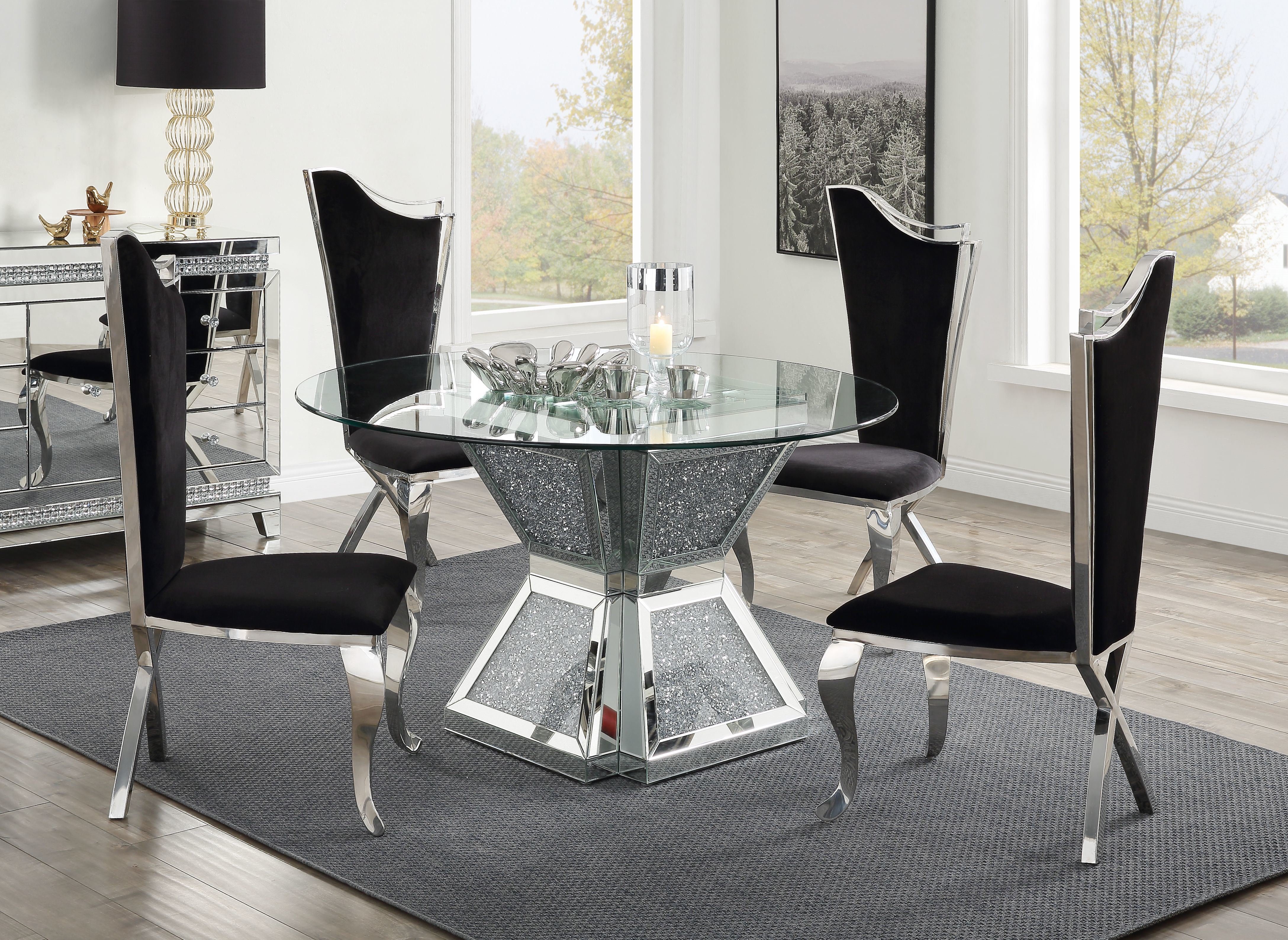 Set includesSet includes: Two (2) side chairsDimensions43 inches high x 21 inches wide x 20 inches deepMaterialsFabric, Stainless Steel, Plywood, FoamFabric ColorBlackFinish ColorSilver