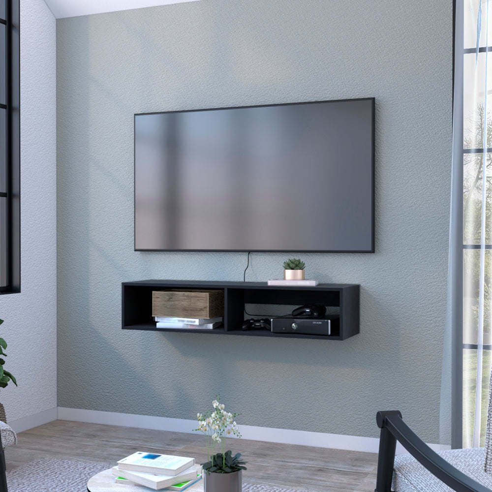 The "Shelley Entertainment Center" modernizes your living space with its elegant black finish and functional design. This wall-mounted piece features two generous shelves (22.9"W x 12.5"D), offering a stylish solution for organizing your media essentials while saving floor space.Dimensions: Height: 9,96'Width: 47,68' Depth: 12,60'Furniture Type: Ready to assemble (full assembly required).Certifications: CARB phase II compliant – TSCA Title VI Compliant.Warranty: 1-year warranty coverage in wooden parts- 1-year warranty coverage in hardware pieces since its manufacturing date is found in the lot number printed in the product box.Shipment details: Free shipping to the 48 contiguous states - delivery time: Between 2 and 5 days, depending on the customer's location, season, and weather factors.Other details: This product does not include decorative or background elements; Check that the box is in good condition and well packed and check with the help of the manual that the corresponding parts have been included; For more information regarding warranty, shipment details, cancellations, returns & replacement parts go to the bottom section of our website to learn more; Installation & Assembly Instructions included.