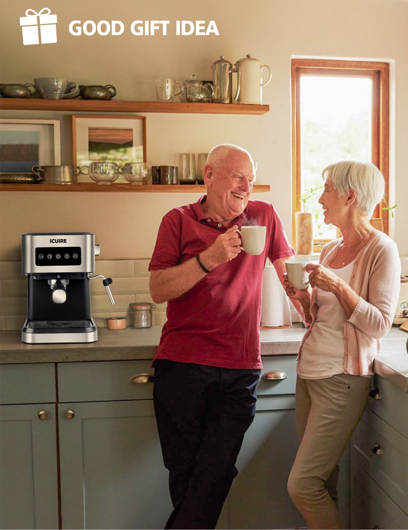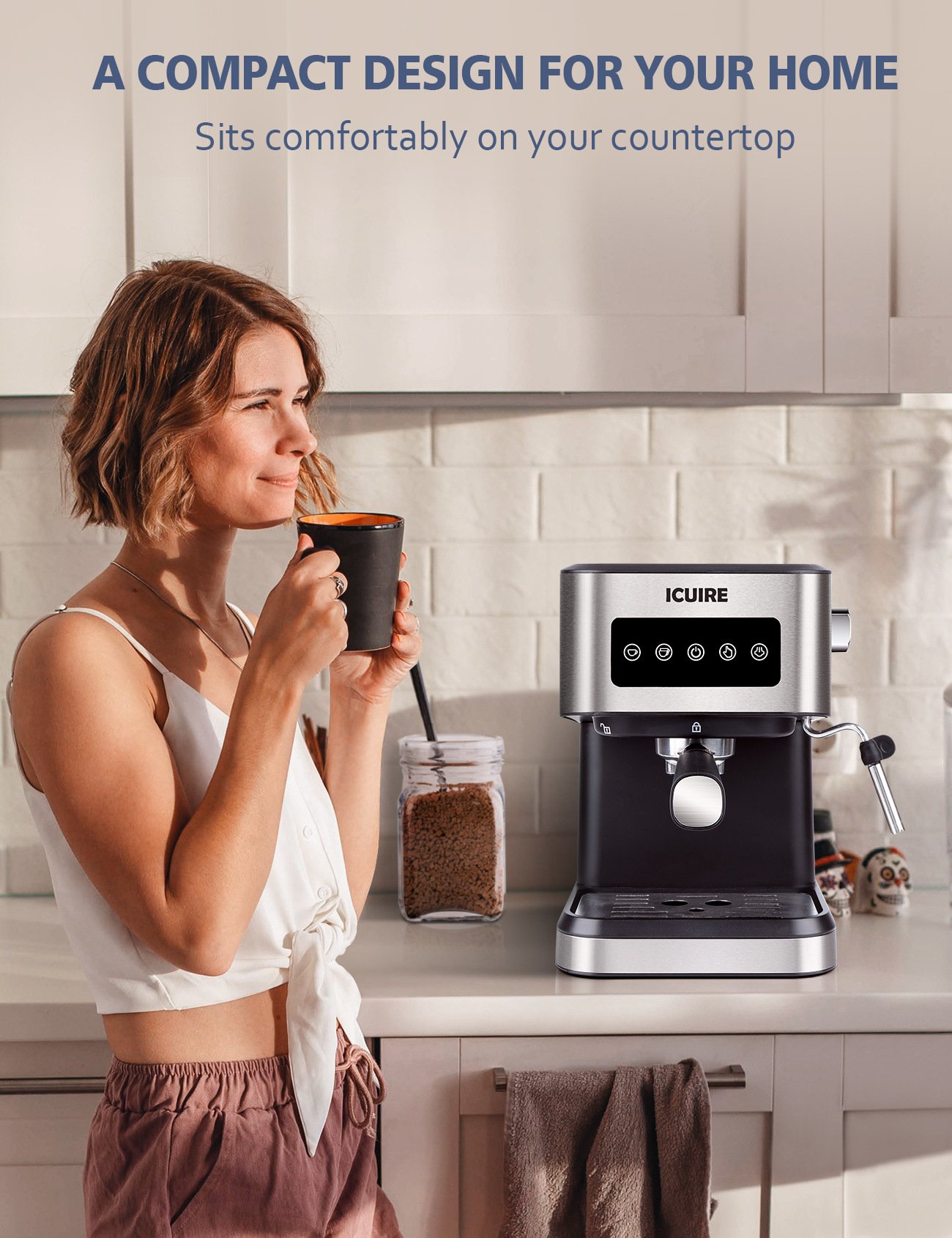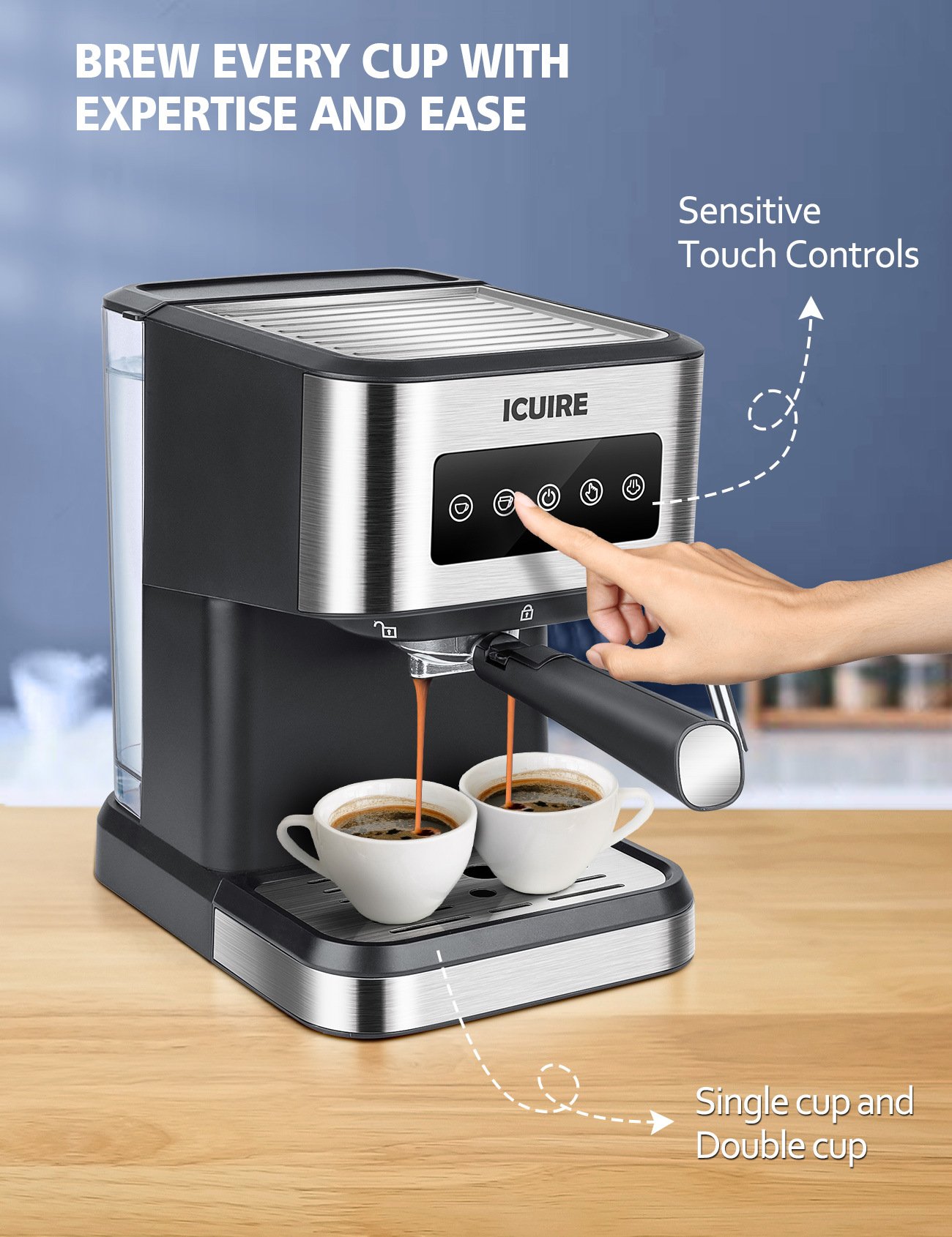 2.20 Bar Professional Pump & Barista-brewed Flavor--- Semi-Automatic Coffee Machine, 20 bar professional Italian pump, 1050W powerful pressure to extract rich crema and foams creamy milk in short time.