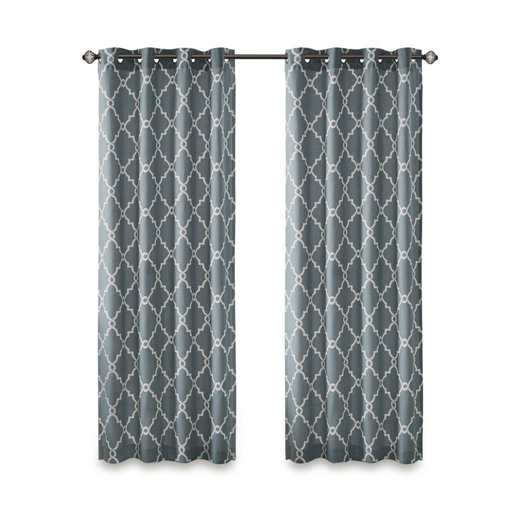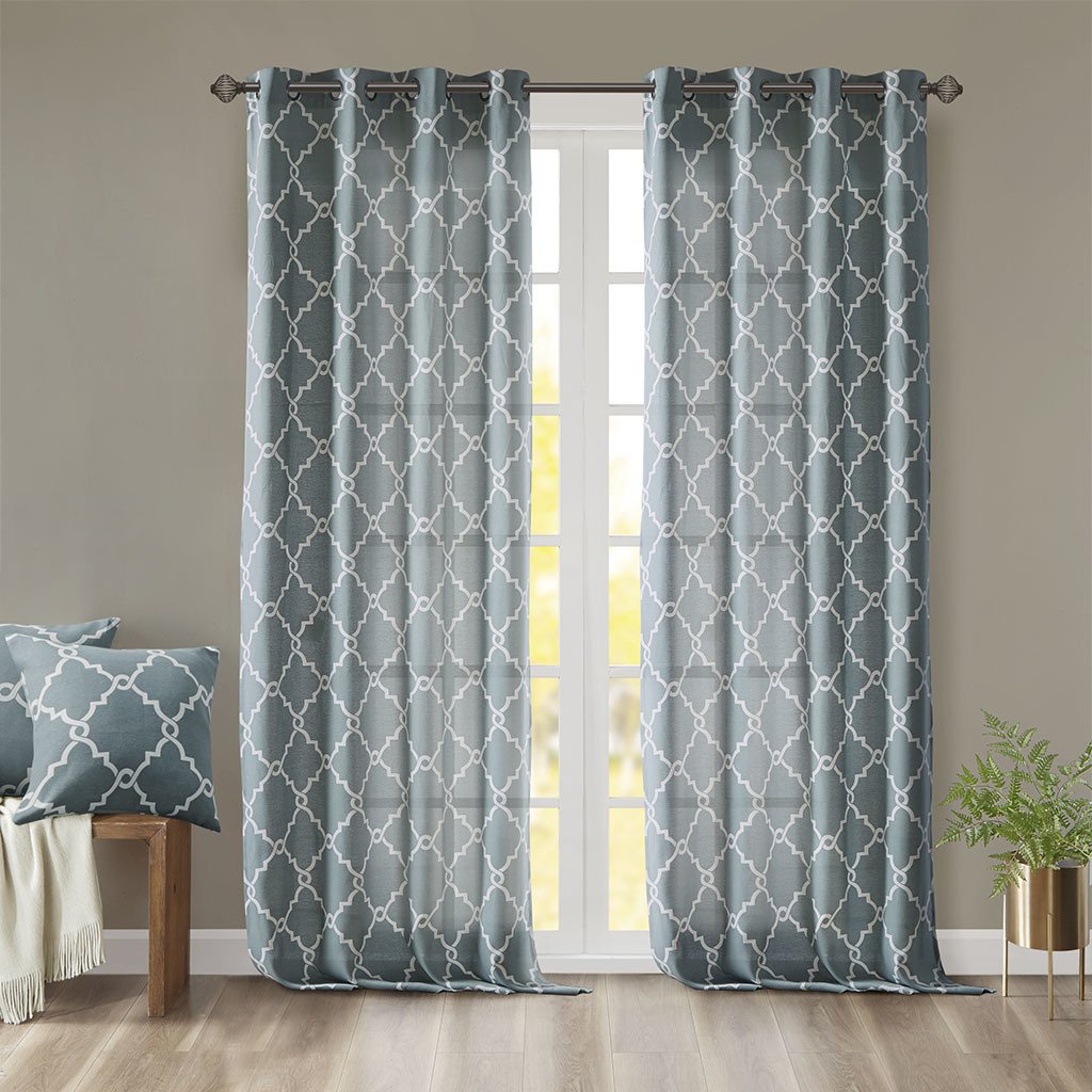 The Madison Park Saratoga Fret Print Panel is the perfect addition for a casual and stylish update to your home decor. This window panel features a trendy light beige fretwork on a soft blue ground, creating a simple yet modern look. The cotton blend basket weave fabric softly filters the perfect amount of sunlight into your home, while providing texture for natural appeal. Gunmetal grommet top detail makes this panel easy to hang, open, and close throughout the day. Fits up to a 1.25" diameter rod. Pattern position may vary per panel due to random cutting of fabric.