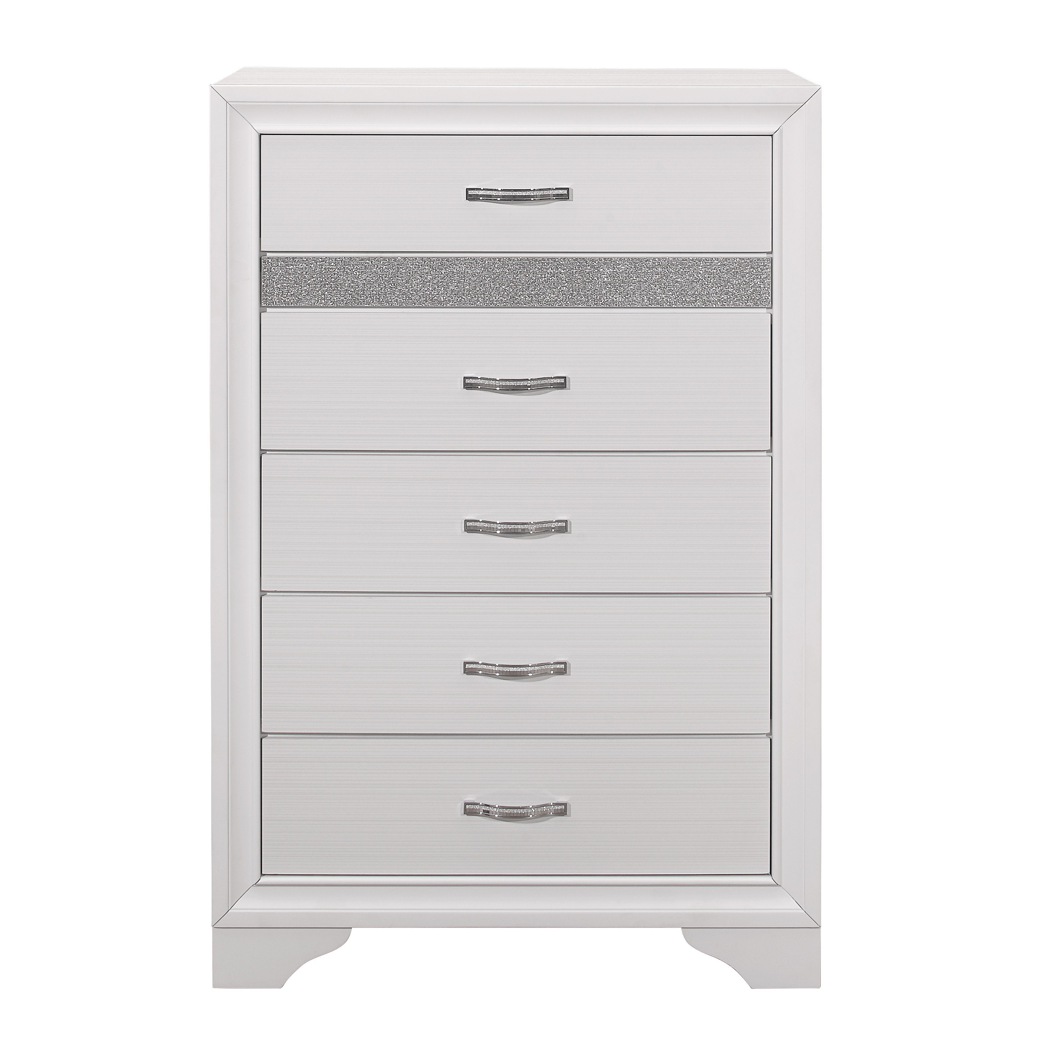 The unique styling of the Luster Collection presents a glamorous option for your bedroom. The chest's embossed faux-wood veneer features a white finish that allows for the acrylic silver glitter front of the hidden jewelry drawer to shine. The jewelry drawer features felt lining to protect your hidden items from wear and tear. Polished chrome bar drawer pulls front the drawers providing complementing contrast to the collection's finish.PRODUCT DIMENSIONS: Overall Dimension: 34.5" x 16.5" x 51.5"HDrawer interior: 26.5" x 12.5" x 1.5" (hidden); 26" x 12.5" x 5" (5)Listing Includes: One Chest Only.bed, nightstand, dresser, mirror: Not included.