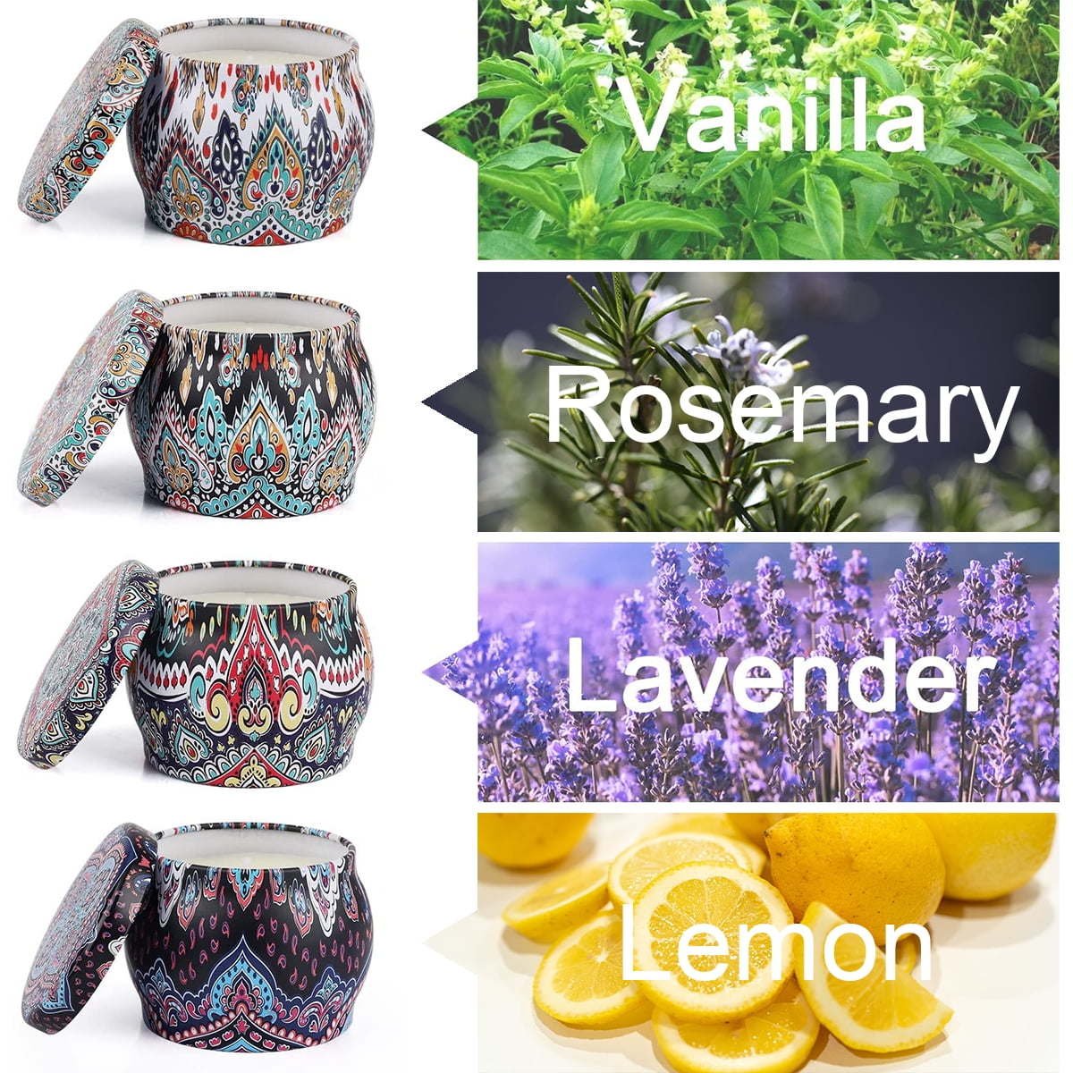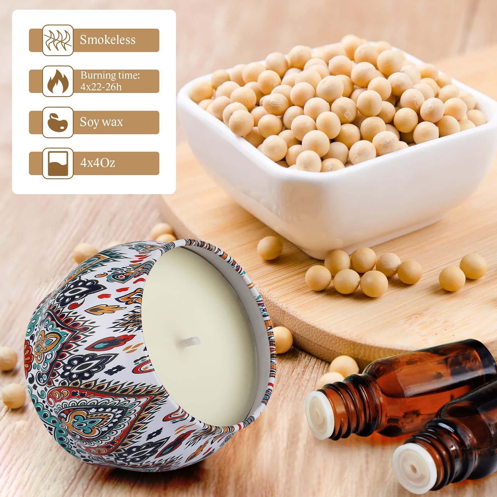 Our fragrance scented candles can help you relax, calm the nerves and relieve anxiety, helping clean, deodorize and purify the air in homes. Perfect candles gift sets, our scented candles are beautifully packed and very suitable for gifts. Our smokeless candles were made from natural soy wax, providing a cleaner, longer burn. 4 oz per tin candle, 22-26 hours burning time. A total of 88-104 hours of combustion.