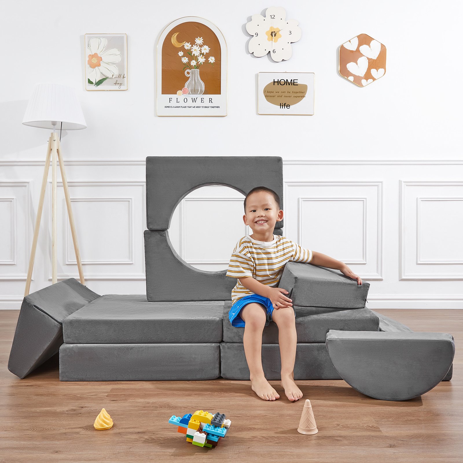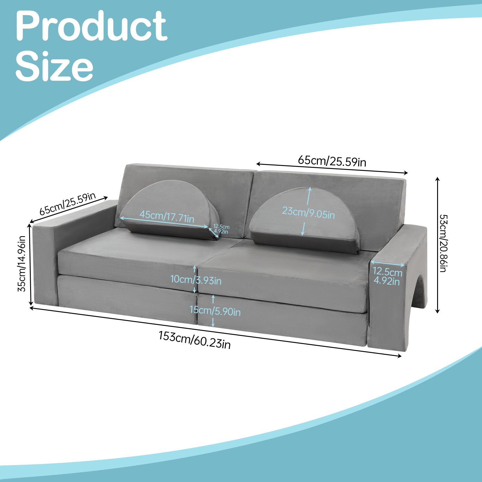 1.10 Piece Modular Kids Sofa: kids sofa features 10 pieces, Square cushion [cushion] : upper: 65*65*10cm*2 pieces Lower:65*65*15cm*2 pieces .Trapezoid [back] :65*28*(8-21)cm*2 pieces. Arch [handrail] : Arch: 65*35*12.5cm*2 pieces of semicircle: diameter 45cm*2 pieces. In addition to a comfortable sofa, it can also use the imagination of children, easily converted into a playhouse, rocket ship, fort, tunnel, bed, and more to meet various needs for playing, climbing, chatting, watching TV or just relaxing. Arrives are already assembled and ready to use