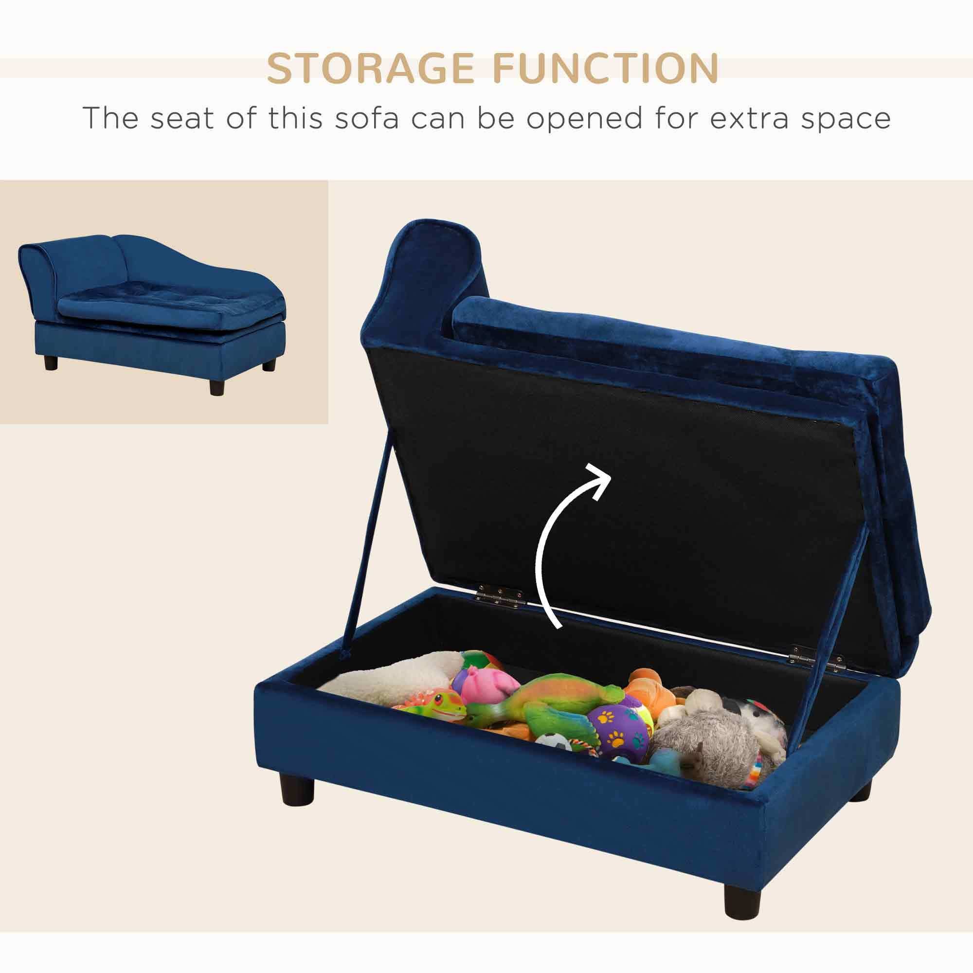 Pet Couch Info: 29.9" L x 17.7" W x 16.9" H. Seat Dimensions: 23.5" L x 16.25" W x 10.25" H. Storage: 25.25" L x 14.75" W x 3.75" H. Suitable for cats and small dogs up to 22 lbs and 13.75" in length. Simple assembly required.
