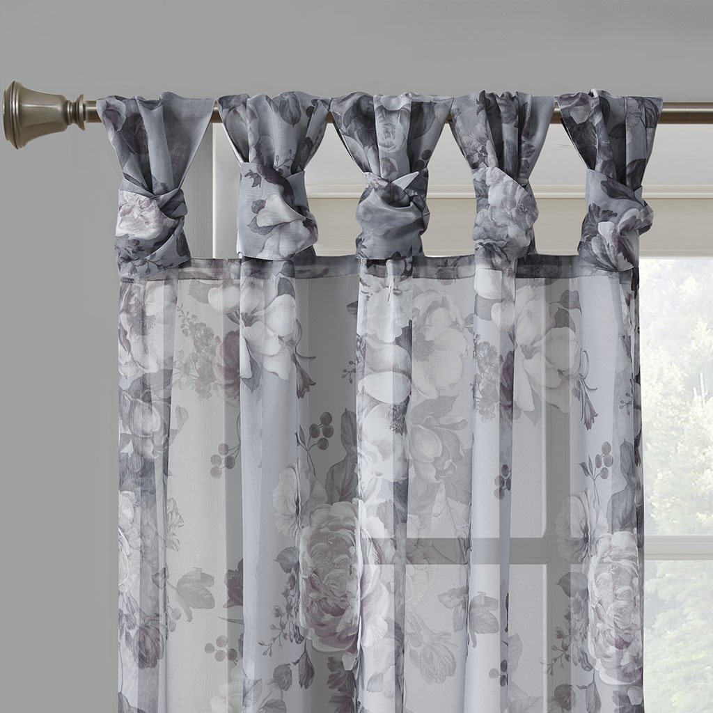 The Madison Park Simone Printed Floral Twist Tab Top Voile Sheer brings a soft and romantic touch to your home decor. This voile sheer curtain panel features a beautiful mauve and neutral printed floral on a dark grey ground for a rich and stylish contrast, while the lightweight fabric adds a delicate and airy touch. Our twist tab top finish allows you to create a DIY design for a unique and stylish touch to your window decor; assembly required for twist tabs - printed directions are included in packaging and video support also available onsite. Each panel is sold separately and machine washable for easy care; Fits up to a 2" diameter curtain rod. These curtains are perfect on its own as a decorative sheer or even better when layered with either coordinating scarf or our Madison Park Emilia solid twist tab panels for a more intricate update!