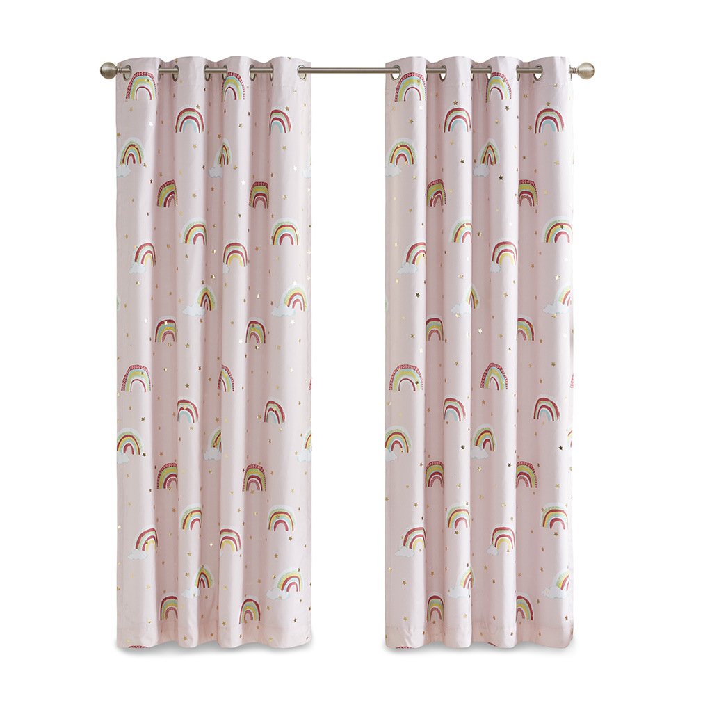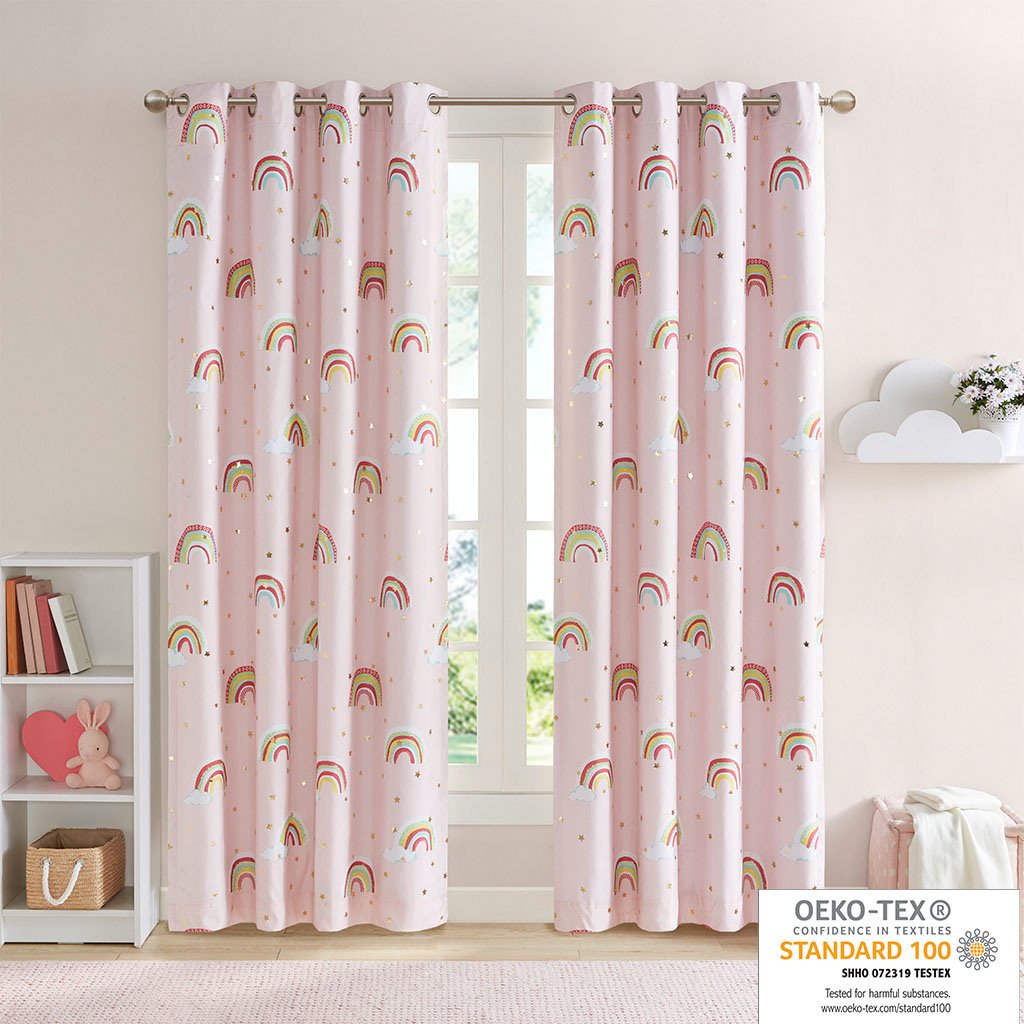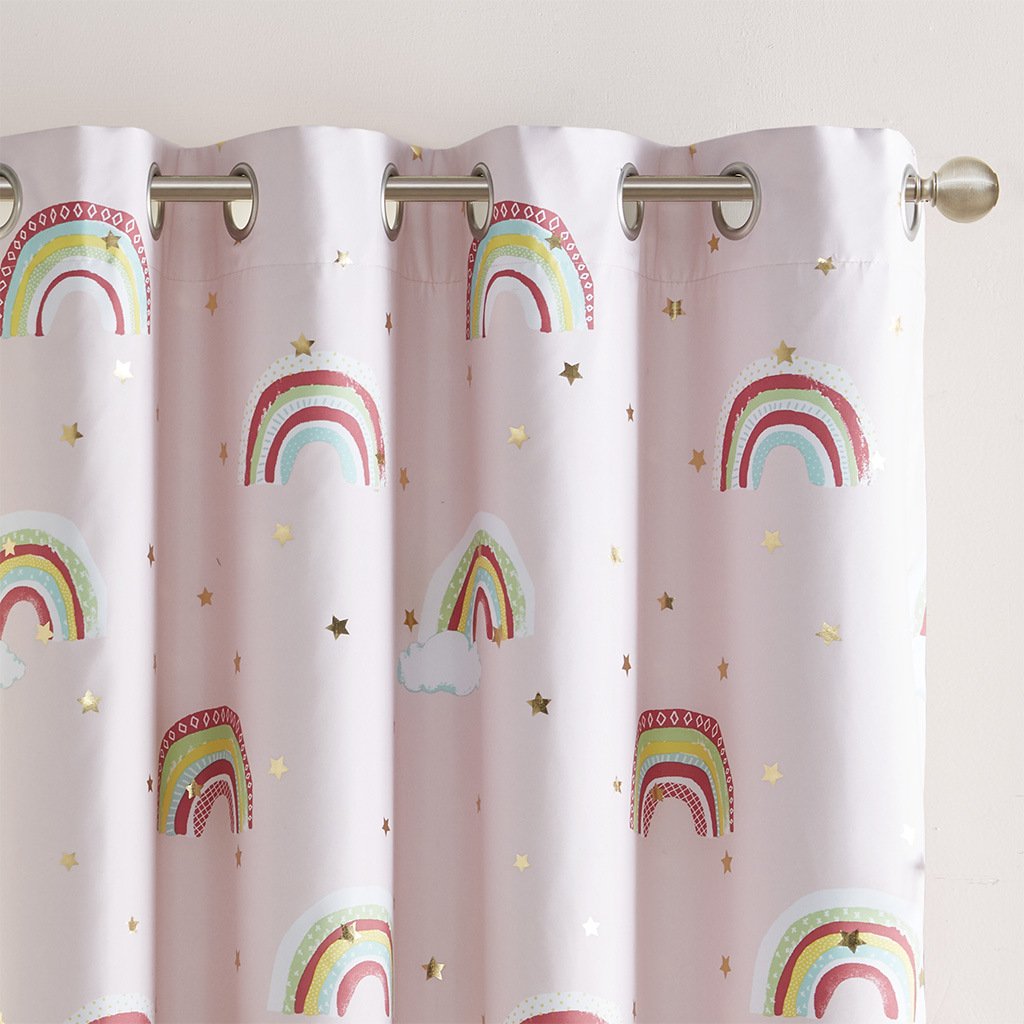 Make your child's bedroom magical with our Mi Zone Kids Alicia Rainbow Metallic Printed Total Blackout Window Panel. This kid's window panel features an all-over rainbow and star metallic print design on a pink ground, for a fun and whimsical look. The 3 Pass Foamback lining on the reverse provides 100% total blackout abilities that help block all exterior light and noise intrusion for the highest level of privacy, while also using thermal layer technology for energy efficiency and maximum energy savings. This panel is also Oeko-Tex Certified and finished with an antimicrobial treatment providing built in freshness protection, inhibiting growth of odor causing bacteria, and keeping linen newer, longer for the best in health and comfort. Antique silver grommet tops make this curtain easy to hang, open, and close throughout the day; grommets fit up to 1.25" diameter rod. As shown in the image, 2 curtain panels need to be purchased to provide standard coverage for each window. Coordinating bedding is available and sold separately.