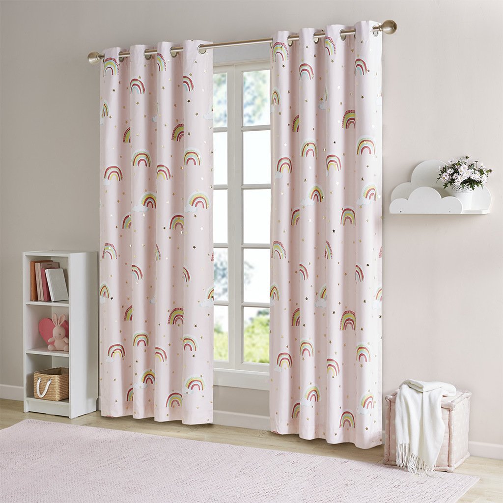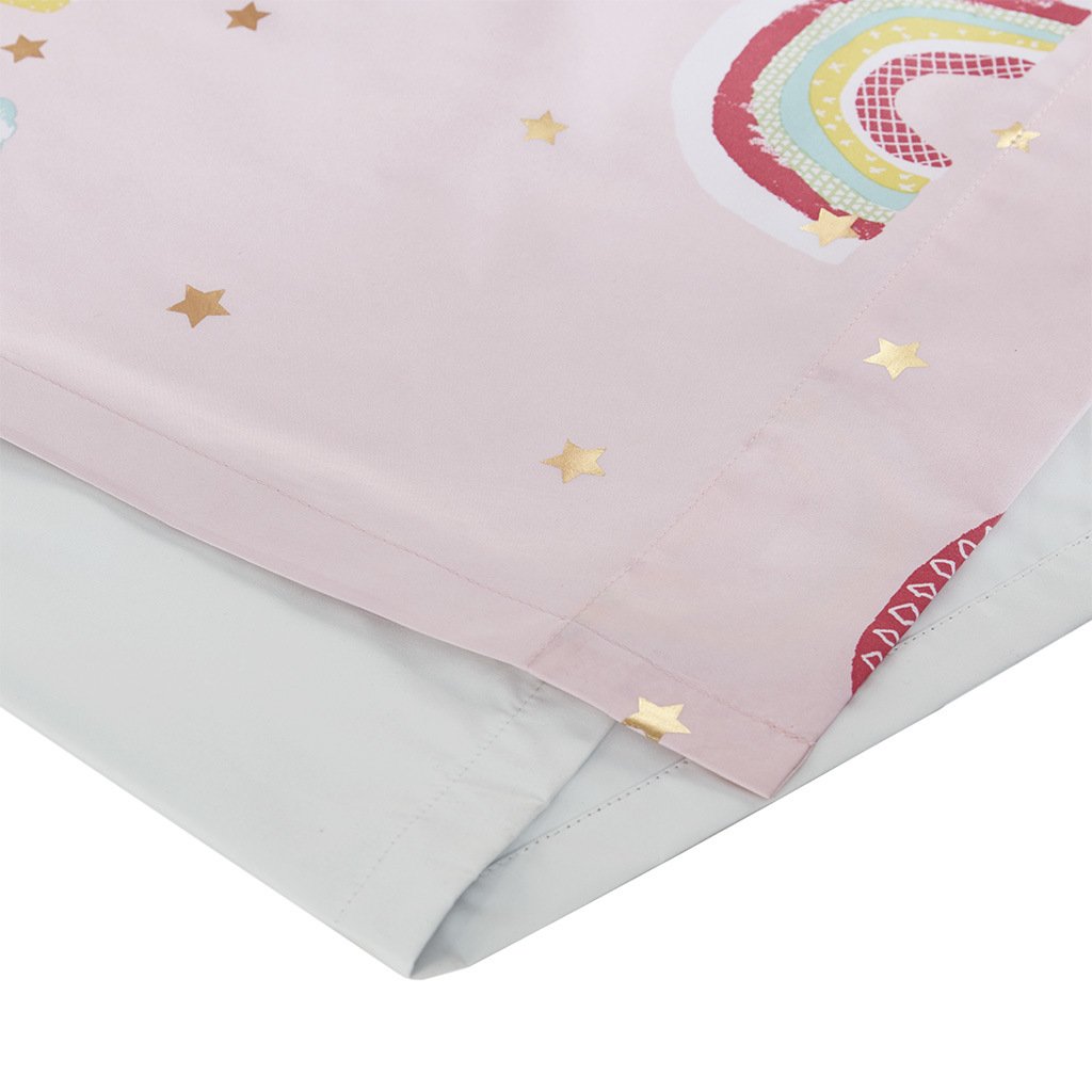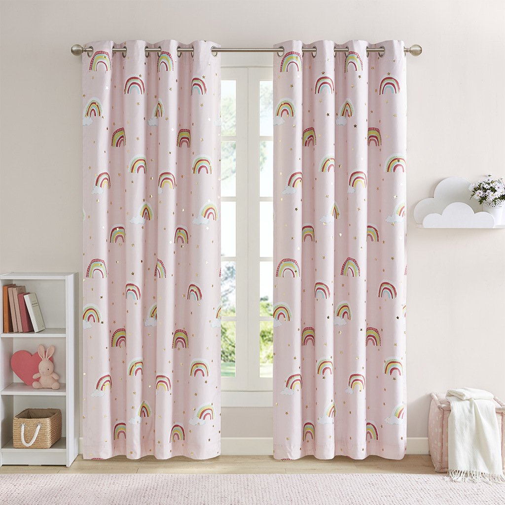 Make your child's bedroom magical with our Mi Zone Kids Alicia Rainbow Metallic Printed Total Blackout Window Panel. This kid's window panel features an all-over rainbow and star metallic print design on a pink ground, for a fun and whimsical look. The 3 Pass Foamback lining on the reverse provides 100% total blackout abilities that help block all exterior light and noise intrusion for the highest level of privacy, while also using thermal layer technology for energy efficiency and maximum energy savings. This panel is also Oeko-Tex Certified and finished with an antimicrobial treatment providing built in freshness protection, inhibiting growth of odor causing bacteria, and keeping linen newer, longer for the best in health and comfort. Antique silver grommet tops make this curtain easy to hang, open, and close throughout the day; grommets fit up to 1.25" diameter rod. As shown in the image, 2 curtain panels need to be purchased to provide standard coverage for each window. Coordinating bedding is available and sold separately.