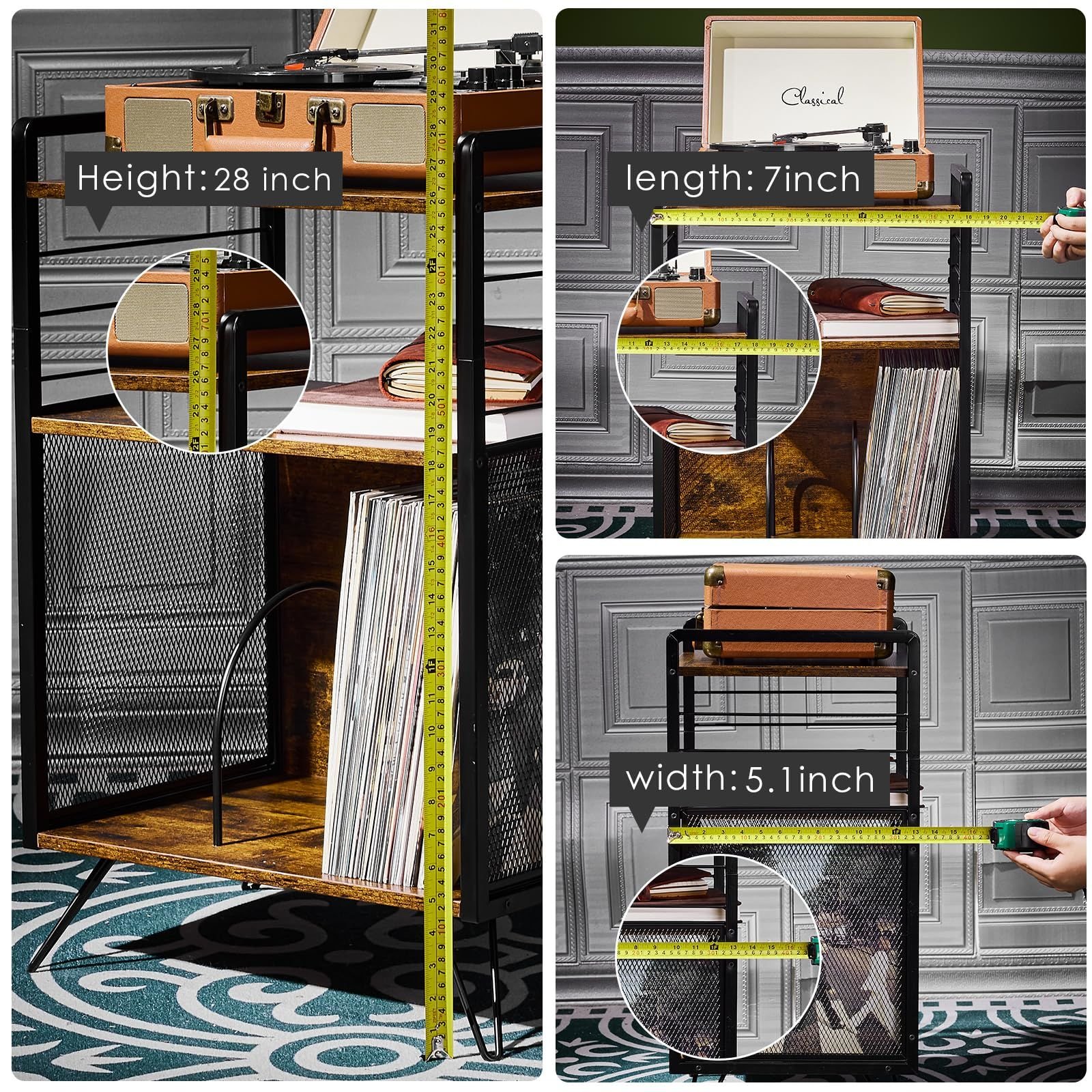 [Sturdy and Elegant Record Player Stand]The record stand is made of vintage wood planks, high-quality iron. The vinyl record storage rack is made of high-quality materials, beautiful, durable, strong and safe. This turntable stand is perfect for your turntable and vinyl records. Product Dimensions 28IN*7IN*5.1IN