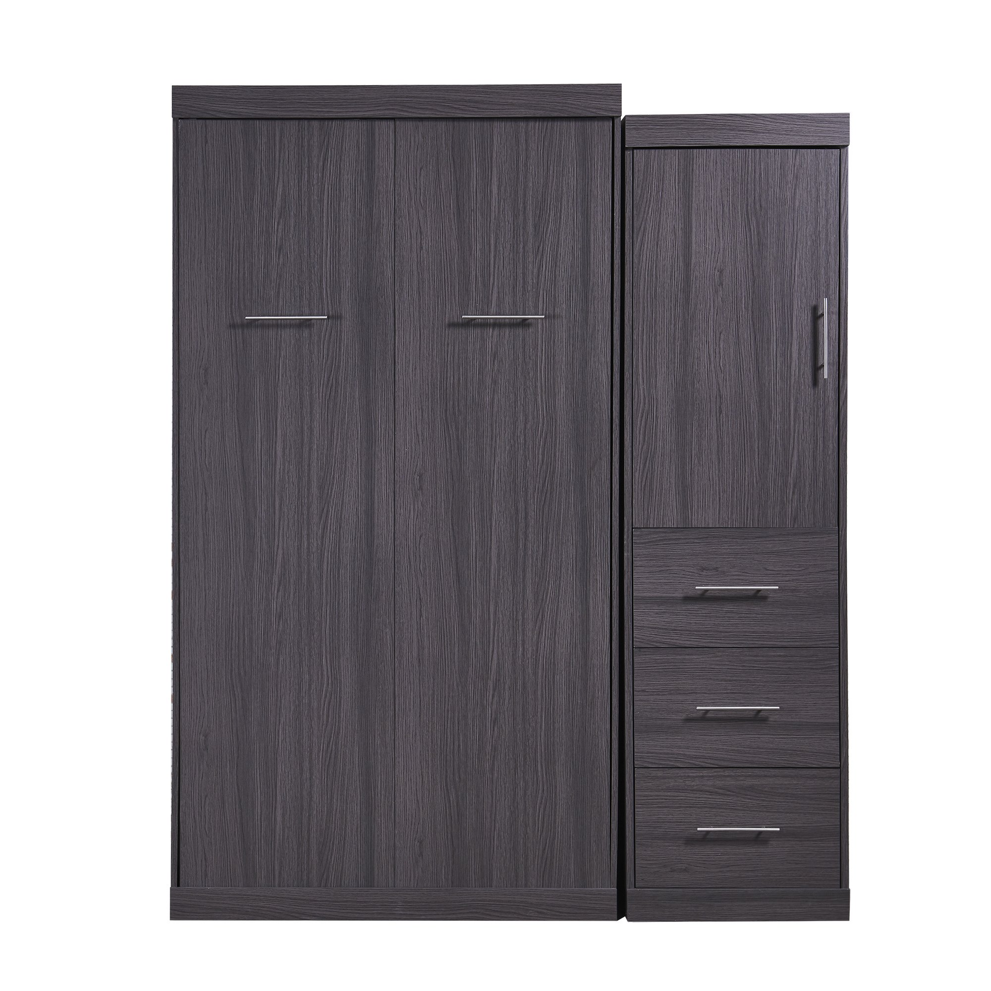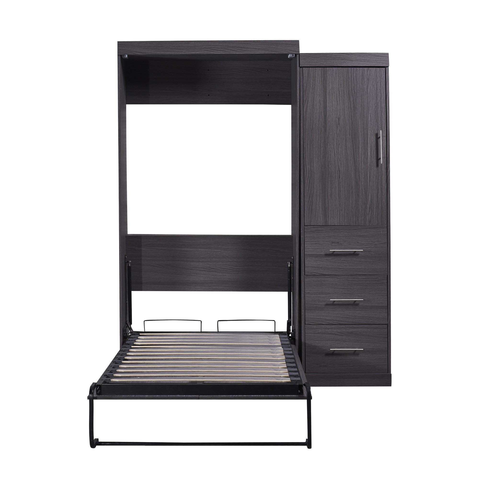 If you don't have enough space in your bedroom and you want to buy a folding bed that doesn't take up too much space; then you should definitely consider this murphy bed. This bed can be folded and placed in a cabinet; and the folded bed is integrated with the cabinet; and it is completely impossible to see that there is a bed placed in this cabinet. And you don't need to worry about the mattress and sheets being left alone in the cabinet when you pull the bed out; because the bed legs are designed with this in mind. When the bed is put down; the white space on the back can be used as a background decoration. Made of high-quality metal and carefully selected pine wood; the bed does not require a spring box to carry your mattress. The bed also has a variety of functions; including a wardrobe for you to hang your clothes and three large drawers so you can enjoy the benefits of multi-tasking. The two cabinets can be swapped left and right; and you can place them the way you like. The modern minimalist style can match any style in your home. Whether you want to buy it for your own use or to entertain friends or guests staying overnight; it is the best choice.