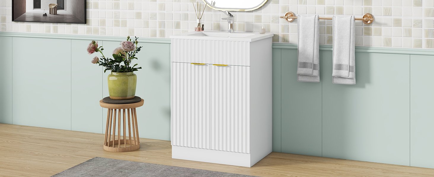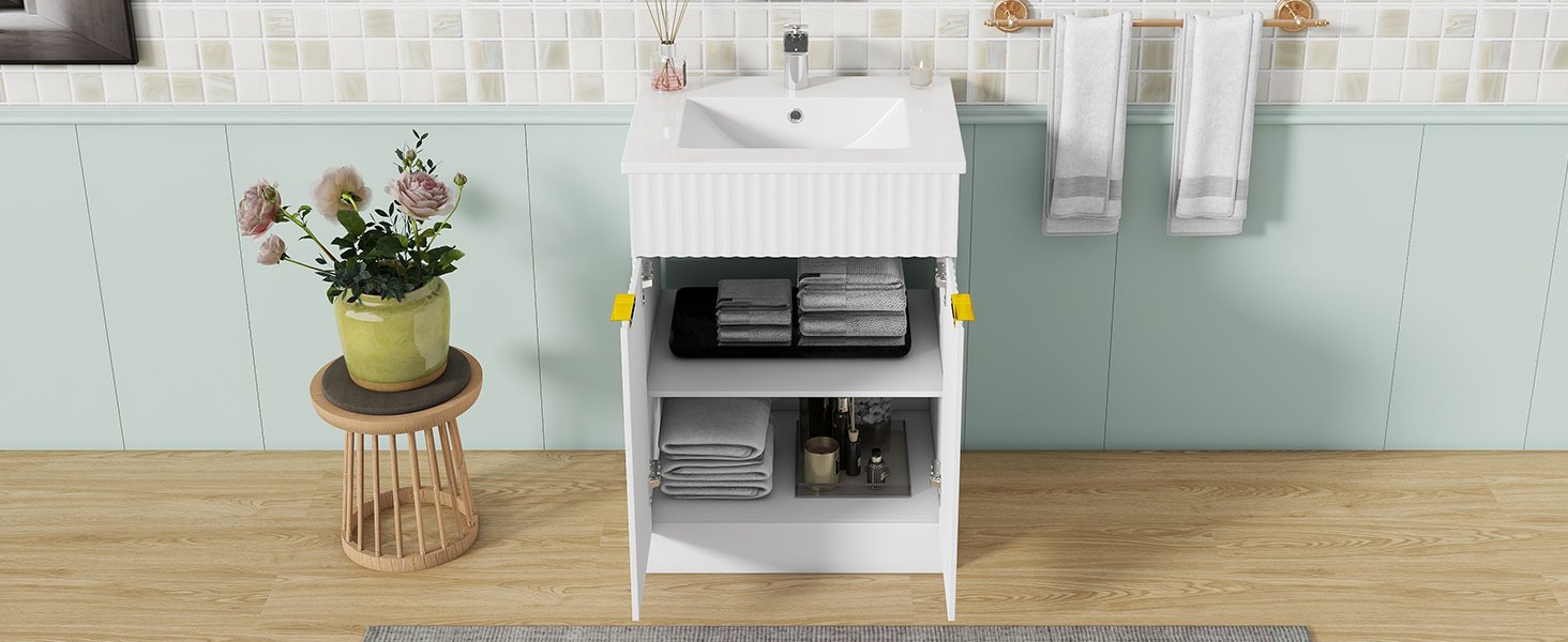 24" Modern White Bathroom VanityWhether it's a modern compact apartment or a villa, our 24-inch white modern bathroom cabinet seamlessly fits into your space, offering a choice that balances functionality and aesthetics. Don't wait – make your bathroom renovation a reality with our exquisite selection!Modern Wavy Cabinet Door:The distinctive wavy pattern adds an artistic touch to the door, bringing a contemporary flair to your bathroom.Gold-Tone HandleThe gold-tone handle accents the white cabinet body, creating a sense of luxury that highlights your bathroom. Soft-Close Hinges: Innovative soft-close hinge technology guarantees a smooth and quiet door closure, preventing noise and accidental collisions.Space-Optimizing DesignMeasuring 24 inches in width, this vanity is thoughtfully designed for compact spaces, maximizing utility without sacrificing style.Weights&DimensionsProduct Size:24"W*18.3"D*33.9"H, 61 lbsSink:24"W*18.3"D*5.9"H, 23 lbsVanity:23"W*16.8"D*33.1"H, 38 lbsSuit Package(WF319595AAK):37.99"*24.41"*16.14", 79.15 lbsWeight Capacity:Overall: 220 lbs, Shelf: 50 lbsSpecificationsProduct Name:Bathroom VanityOrigin:MalaysiaStyle:ModernMounting Type:Free-standingCabinet Color:WhiteSink Material:CeramicCabinet Material:MDF+MetalHandle Material:Aluminum AlloyFinish Type:Painted FinishSink Type:Undermount/Drop inSink Shape:RectangularOverflow Hole included:YesVanity Top Edge Type:FlatEdge Thickness:0.8"Number of Doors:2Number of Drawers:0Soft Close Door Hinges:YesShelves Included:YesAssembly:Assembly RequiredNumber of packages:1