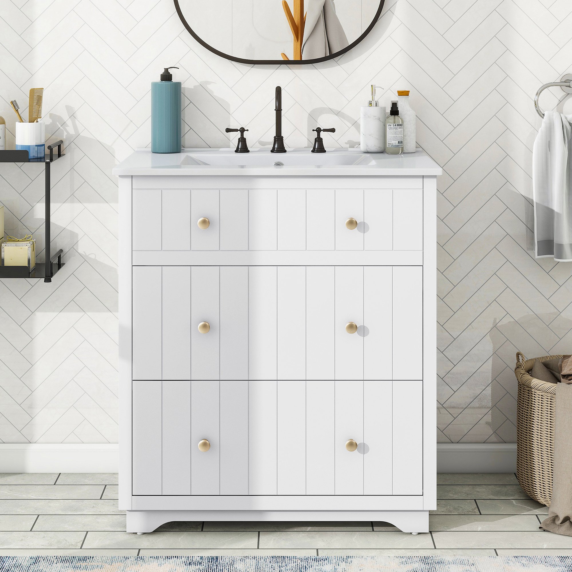 30-Inch Modern White Bathroom Vanity Cabinet with two drawersWhether you're renovating your bathroom or starting from scratch, this 30-inch White Painted Bathroom Vanity Cabinet is the perfect choice. Elevate your bathroom's style and functionality today!Timeless White FinishThe classic white paint finish not only brightens up your bathroom but also complements any decor style, from modern to traditional.Space-Saving DesignThe 30-inch width of this vanity cabinet is a perfect fit for any bathroom size, providing ample storage without taking up too much space.Plastic Foot PadsOur vanity cabinet comes equipped with plastic foot pads that prevent scratching and damage to your precious flooring, offering peace of mind and added protection.Weights&DimensionsProduct Size:29.9"W*18.3"D*33.8"H, 92.4 lbsSink:29.9"W*18.3"D* 6.7"H, 30.9 lbsVanity:29.1"W*17.7"D*33.2"H, 61.5 lbsSuit Package(WF319596AAK):37"*24.41"*16.93", 103.62 lbsWeight Capacity:Overall: 110 lbs; Drawer: 22 lbsSpecificationsProduct Name:Bathroom VanityOrigin:MalaysiaStyle:ModernMounting Type:Free-standingCabinet Color:WhiteSink Material:CeramicCabinet Material:Solid wood+MDFHandle Material:Zinc AlloyFinish Type:Painted FinishPainted FinishUndermount/Drop inSink Shape:RectangularFaucet Mount:Centre 8" (not included)Overflow Hole included:YesVanity Top Edge Type:FlatEdge Thickness:0.6"Number of Doors:0Number of Drawers:2Soft Close Door Hinges:NoAssembly:Assembly RequiredNumber of packages:1