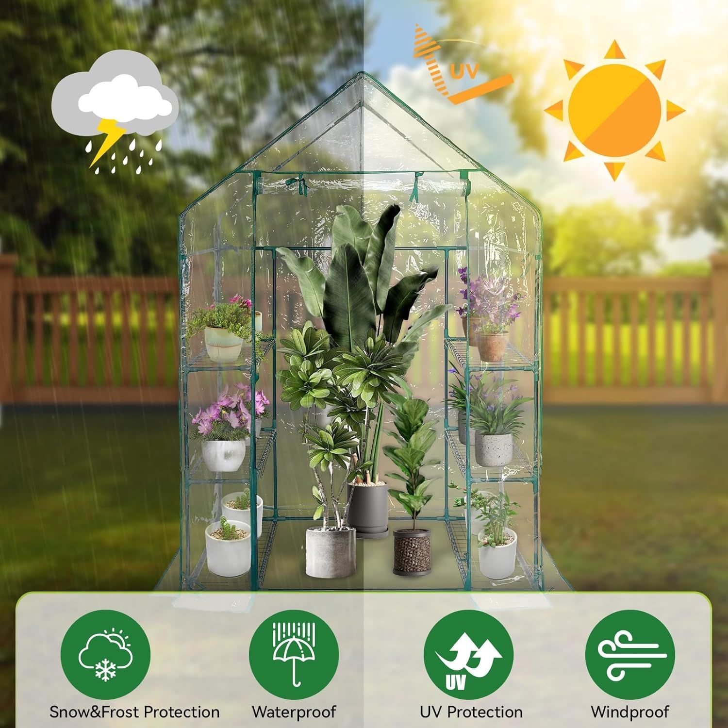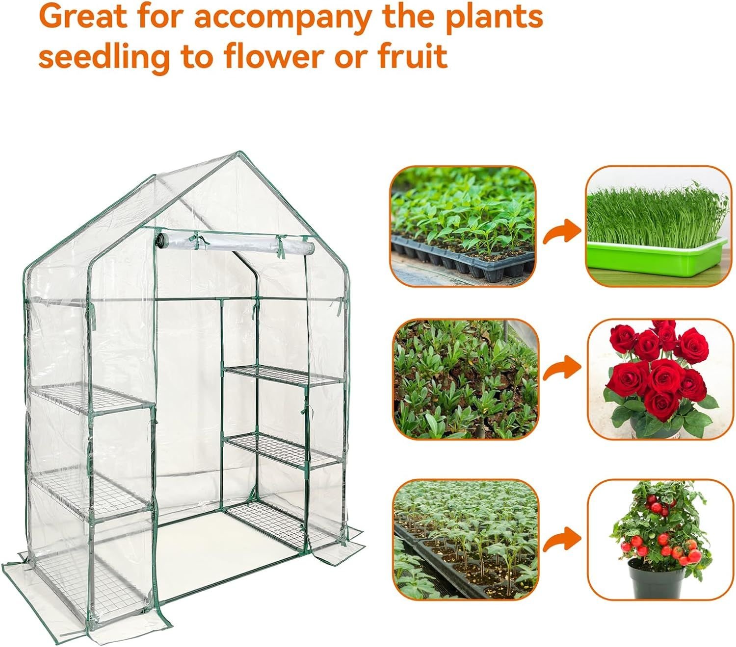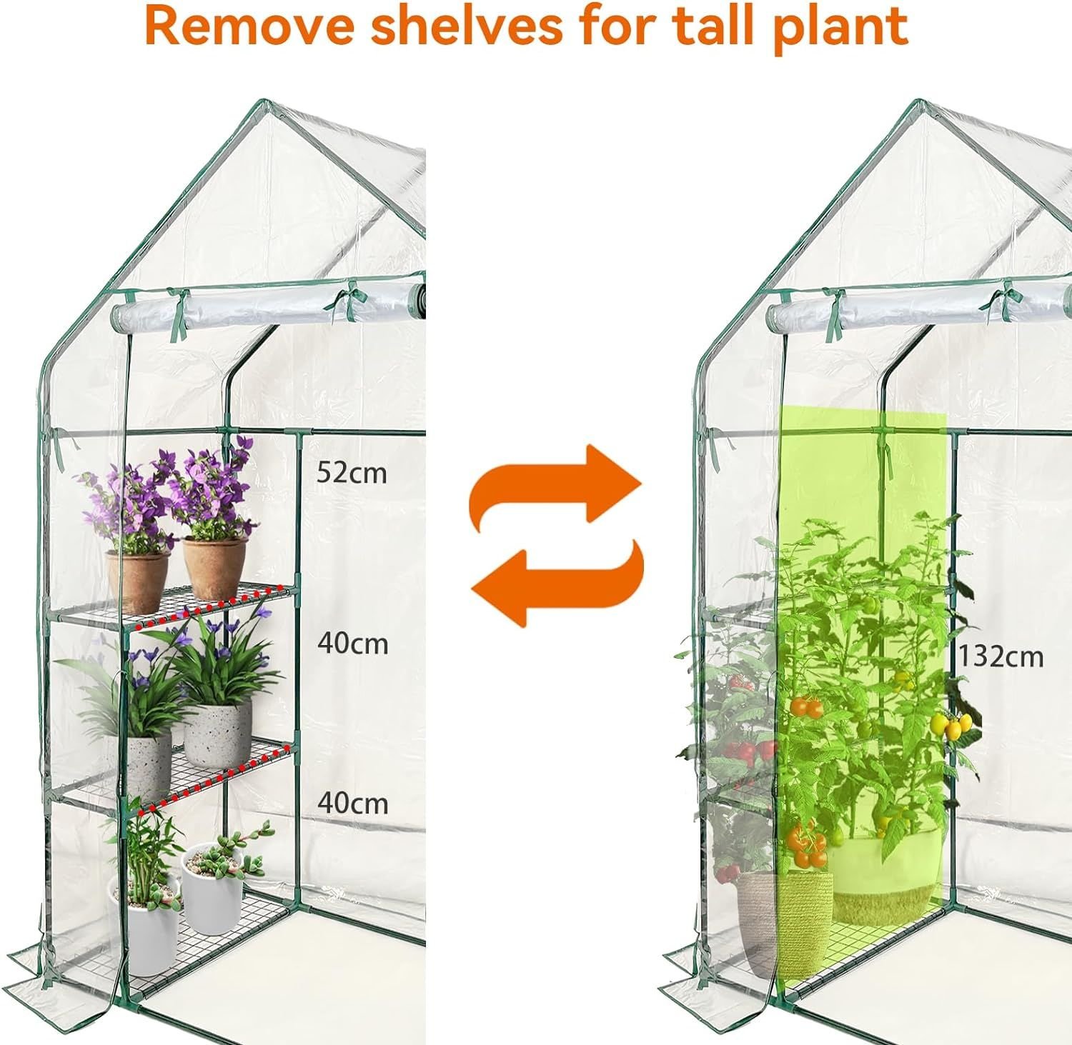 Do you want to care for plant growth all the season? Greenhouse kits for outdoors protects your plants from frost, excessive sun exposure, and also keeps the interior moist. Closing the roll up door of the green house can prevents small animals from damaging the plants. Relatively constant temperatures and moist conditions will allow plants to grow earlier and extend the growing season.This Mini Greenhouse provide the perfect solution for those smaller gardens that cannot accommodate a conventional greenhouse. It can protect your plants from too much heat or cold, shield plants from dust and gale, and help to keep out animal. It has a strong metal frame and green PE cover with zips for easy access and ventilation. Inside with shelves, ideal for pots and seed trays.Features:Material: Green PVC Cover, Powder coated Metal TubeWeight Capacity: 17 lbs each shelfShelves: 3 Tier 6 Wired ShelvesThe roll-up door design is easy to access and take care of your plants. Opening the roll up door when the climate is suitable can also promote air circulation and plant growth in the greenhouseThe wired shelves are fully painted and welded to make the wire crisscross, which has superior rust proof and load-bearing capacity.Equipped with ground spikes, used with ropes to keep your greenhouse stable to protect your plants, seeds and flowers from the strong wind2 Velcro Side Windows for summer time ventilation and ObservationIndoor and Outdoor Greenhouse for Garden/Patio/Backyard/ BalconySpecification:Product Dimension: 55"(L) X 27.5"(W) x 78.7:(H)Door Dimensions: 34"(W) X 61"(H)Window Dimensions: 11.8"(W) X 11.8"(H)Package1 X Greenhouse for Outdoor.1 X InstructionTIPS:Suggest to use a rubber mallet to make sure all pipes joint tightly **suggest to put a heat lamp in it and stake it well when use in Winter