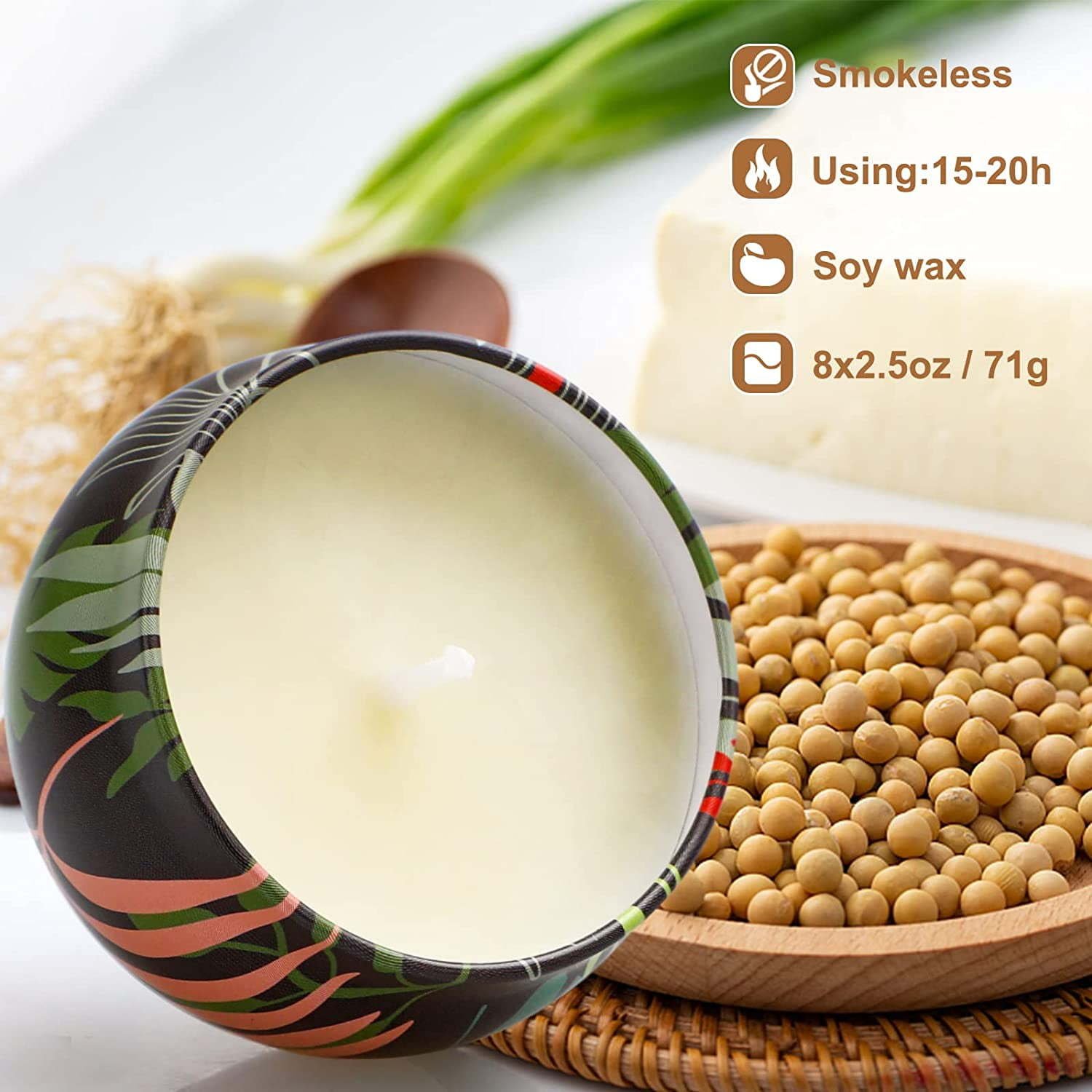 Only use oils that can be perfectly blended with soy wax, attractive packaging comes with 8 different fragrances. Every candle uses different essential oil.